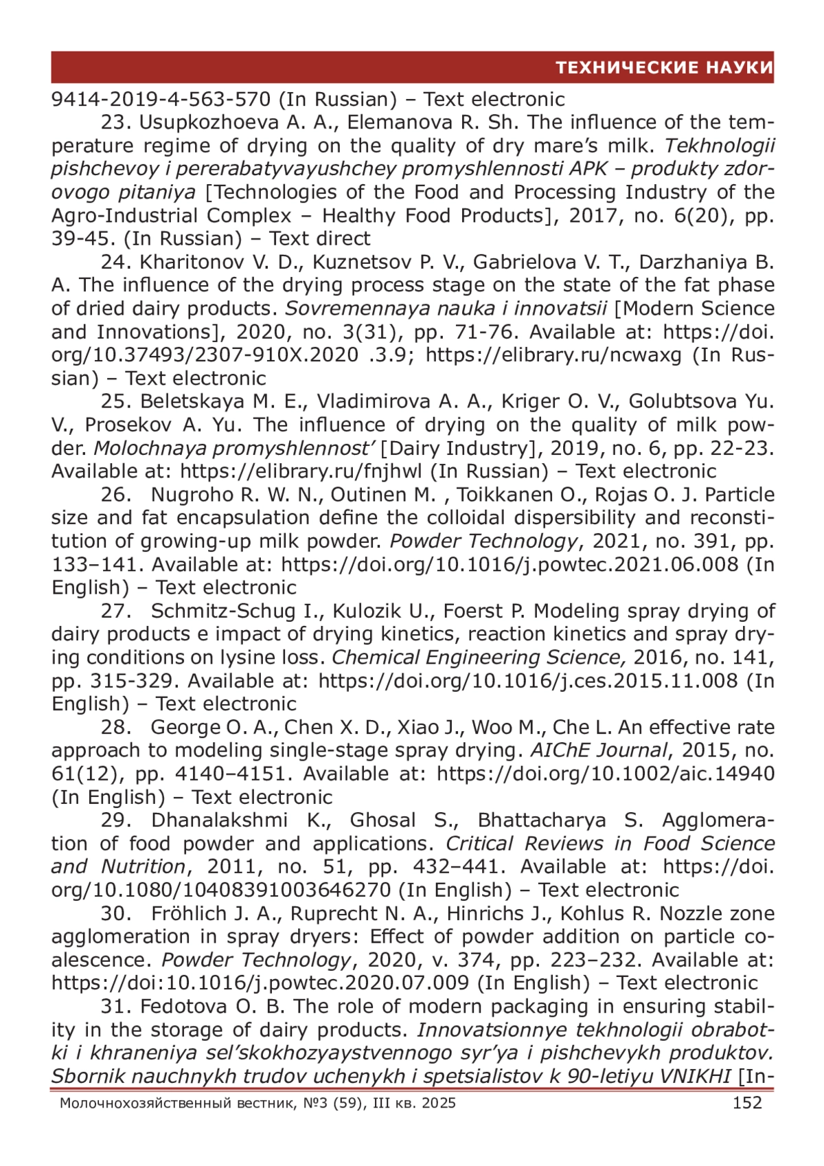 32. Fröhlich J. A., Ruprecht N. A., Hinrichs J., Kohlus R. Nozzle zone agglomeration in spray dryers: Effect of powder addition on particle coalescence. Powder Technology, 2020, v. 374, pp. 223-232. Available at: https:// (In English) - Text electronic. DOI: 10.1016/j.powtec.2020.07.009