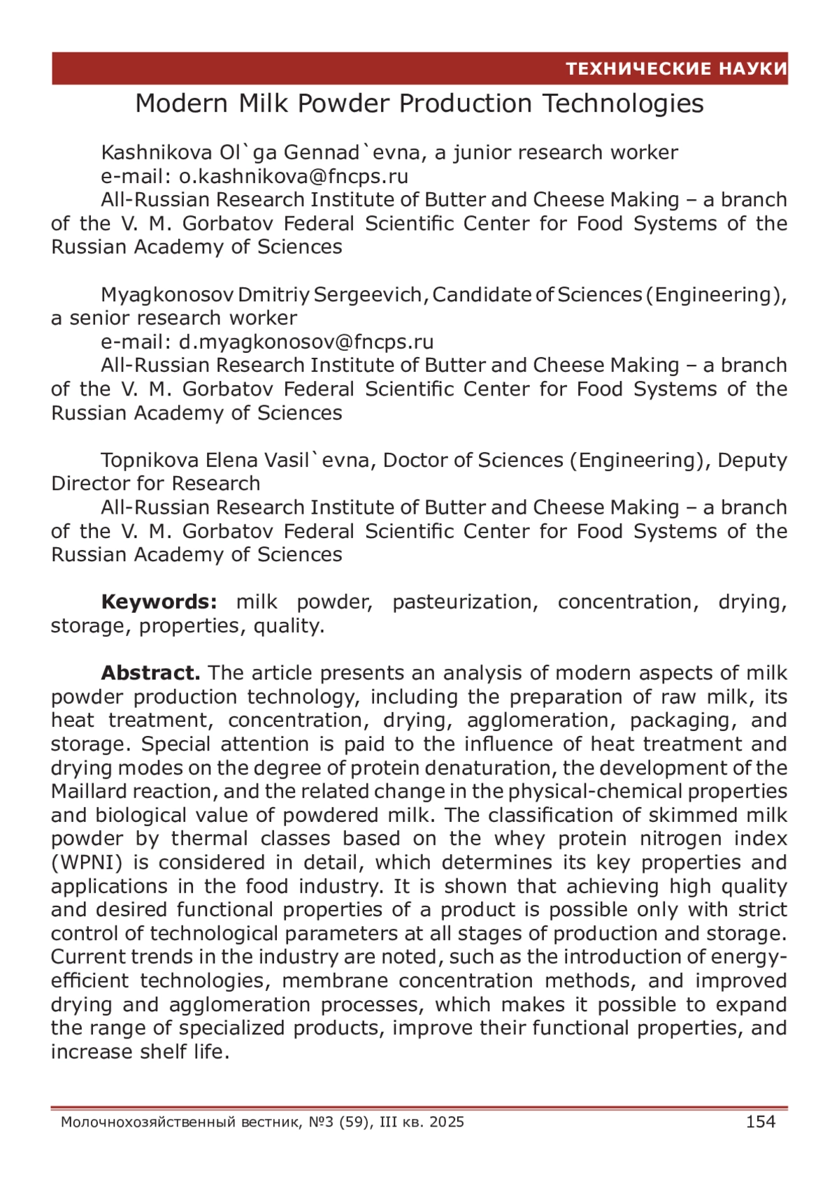 В статье представлен анализ современных аспектов технологии производства сухого молока, включающего подготовку молока-сырья, его тепловую обработку, концентрирование, высушивание, агломерирование, упаковывание и хранение. Особое внимание уделено влиянию режимов тепловой обработки и высушивания на степень денатурации белков, развитие реакции Майяра и связанное с этим изменение физико-химических свойств и биологической ценности сухого молока. Подробно рассмотрена классификация сухого обезжиренного молока по тепловым классам на основе индекса азота сывороточных белков (WPNI), что определяет его ключевые свойства и области применения в пищевой промышленности. Показано, что достижение высокого качества и заданных функциональных свойств продукта возможно лишь при строгом контроле технологических параметров на всех этапах производства и хранения. Отмечены современные тенденции в отрасли, такие как: внедрение энергоэффективных технологий, мембранных методов концентрирования, совершенствование процессов сушки и агломерирования, что позволяет расширить ассортимент специализированных продуктов, улучшить их функциональные свойства и увеличить сроки хранения.