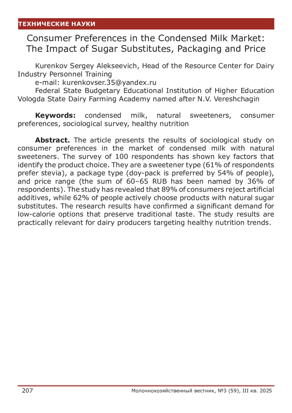 Представлены результаты социологического исследования потребительских предпочтений на рынке сгущенного молока с натуральными сахарозаменителями. На основе результатов опроса ста респондентов выявлены ключевые факторы, влияющие на выбор продукта: тип подсластителя (61 % предпочитают стевию), упаковка (дой-пак – 54 %) и ценовой диапазон (60–65 руб. – 36 %). Установлено, что 89 % потребителей негативно относятся к искусственным добавкам, а 62 % целенаправленно выбирают продукты с натуральными заменителями сахара. Исследование подтвердило высокий спрос на низкокалорийные решения, сохраняющие традиционный вкус. Результаты имеют практическую значимость для производителей молочной продукции, ориентированных на тренды здорового питания.