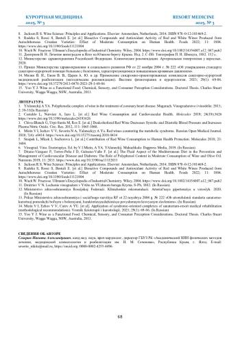 1. Яланецкий А. Я. Полифенольный комплекс вина при лечении ишемической болезни сердца. Магарач. Виноградарство и виноделие. 2013; 2: 30-33.