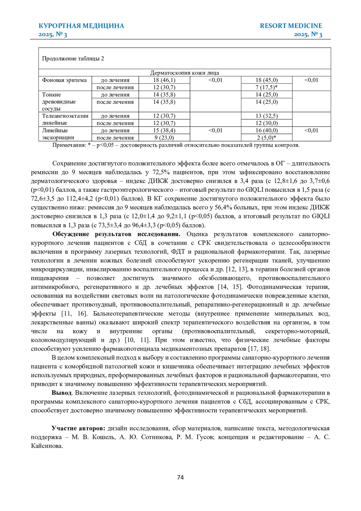 Результаты. Включение в программы санаторно-курортного лечения пациентов с СбД, ассоциированным с СРК, лазерных технологий, фотодинамической и рациональной фармакотерапии обеспечило в ОГ значимое снижение клинических проявлений как СбД (р<0,01), так и СРК (р<0,01), улучшение данных трихоскопии (р<0,01) и дерматоскопии кожи лица (р<0,01) при межгрупповых различиях во всех случаях р<0,05. Степень тяжести СбД по Seborrheic Dermatitis Area and Severity Index у пациентов ОГ соответствовала умеренной, а после – легкой, тогда как в КГ, несмотря на достоверно значимое (р<0,01) снижение степень тяжести основного заболевания оставалась умеренной. Результирующим явилось существенное восстановление качества жизни, что подтверждалось при анализе динамических показателей по опросникам дерматологического (р<0,01) и гастроэнтерологического (р<0,01) больного при межгрупповых различиях во всех случаях р<0,05.