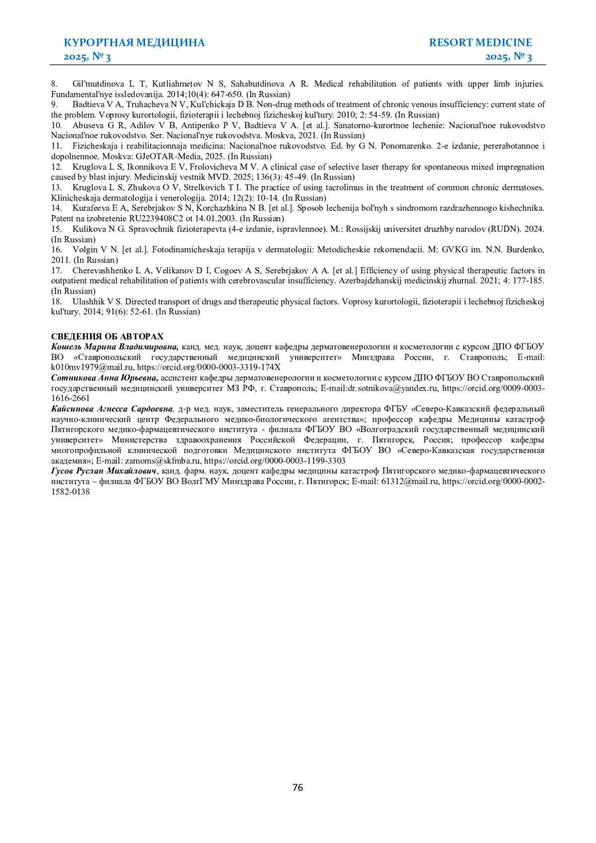 10. Абусева Г. Р., Адилов В. Б., Антипенко П. В., Бадтиева В. А. и др. Санаторно-курортное лечение: Национальное руководство. Сер. Национальные руководства. Москва, 2021.