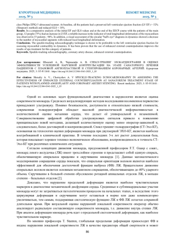Выводы. Показана предпочтительность методики спекл-трекинг-эхокардиографии по сравнению с фракцией выброса левого желудочка для оценки сократимости миокарда в динамике. Доказано, что использование УНКП улучшает результаты санаторно-курортного лечения данной категории больных.
