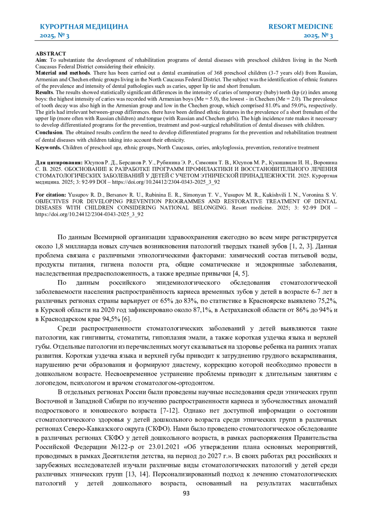 Материал и методы. Проведено стоматологическое обследование 368 детей дошкольного возраста (3-7 лет) из русской, армянской и чеченской этнических групп, проживающих в Северо-Кавказском федеральном округе. Предметом было выявление этнических особенностей распространенности и интенсивности стоматологических патологий, таких как кариес, короткая уздечка верхней губы и языка.