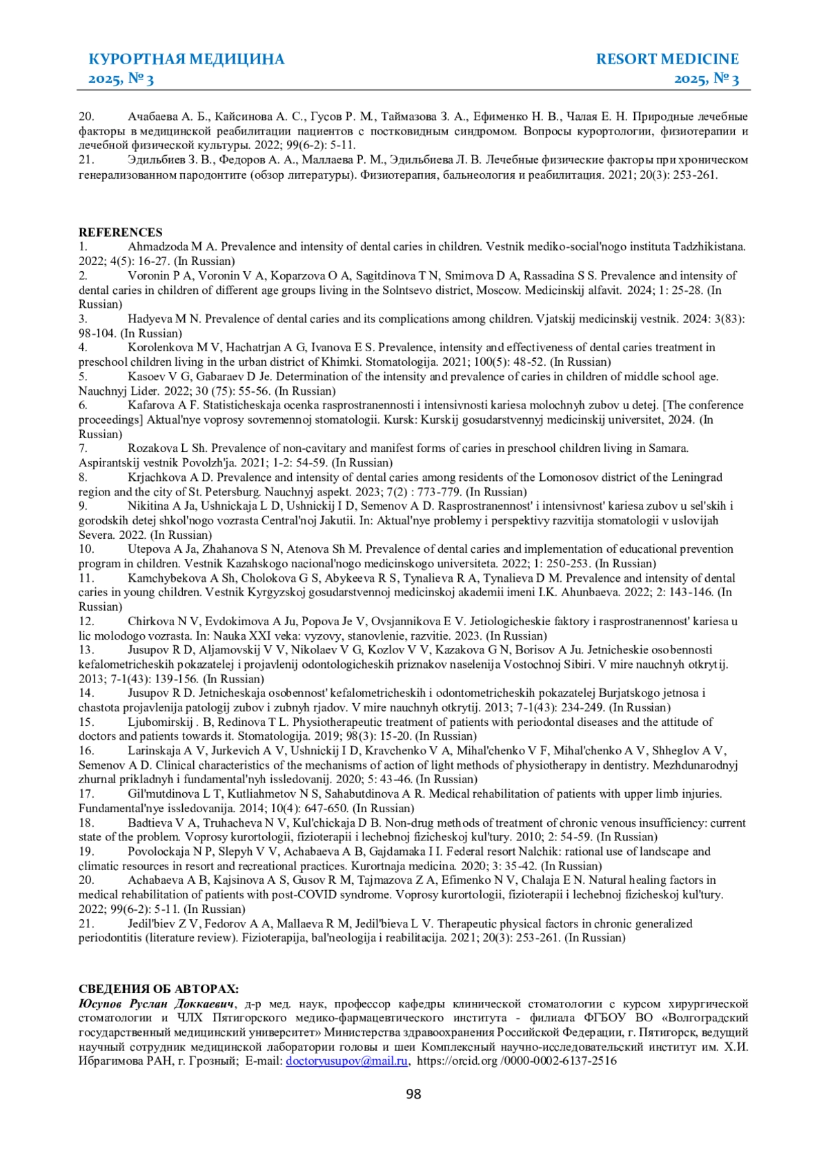 3. Хадыева М. Н. Распространенность кариеса и его осложнений среди детского населения. Вятский медицинский вестник. 2024: 3(83): 98-104.