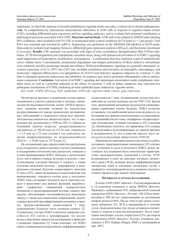 Введение. Хроническая обструктивная болезнь легких (ХОБЛ) – распространенное заболевание с высокой социальной значимостью, в патогенезе которого существенную роль может играть реакция альвеолярного эпителия на сигаретный дым. Цель. Комплексная характеристика транскриптомных изменений в клетках A549, возникающих в ответ на действие экстракта сигаретного дыма (ЭСД), включая анализ дифференциальной экспрессии генов и ключевых сигнальных путей, с оценкой их потенциальной роли в развитии патологического процесса при ХОБЛ. Материалы и методы. Клетки A549 выращивали в среде DMEM до 80% конфлюэнтности, а затем инкубировали с 5% ЭСД или в контрольных условиях в течение 24 часов (n = 3 на каждое условие). Выделенную тотальную РНК подвергали обогащению для получения мРНК. Секвенирование выполняли на секвенаторе MGISEQ-200 в режиме SE50. Обработка данных включала картирование прочтений (Salmon), анализ дифференциальной экспрессии (DESeq2) и функционального обогащения генов (Cytoscape). Результаты. Действие ЭСД сопровождалось признаками дезорганизации актинового цитоскелета (ингибирование Rho ГТФаз, даунрегуляция ACTB) и стресса эндоплазматического ретикулума с парадоксальной активацией mTORC1 сигналинга на фоне подавления транскрипции, пролиферации и апоптоза, что в совокупности может быть охарактеризовано как метаболически активный клеточный стазис. Одновременно с этим отмечалось усиление протеасомной деградации и антигенной презентации собственных, вероятно, дефектных белков с целью стимуляции иммунологического надзора. В то время как провоспалительный сигналинг, в целом, был ослаблен, увеличивалась экспрессия IL1A, SPP1 и CSF3, что может способствовать привлечению и активации нейтрофилов, макрофагов и моноцитов in vivo. Предполагаемые нарушения эффероцитоза (за счет апрегуляции ANXA5) и индукции апоптоза цитотоксическими Tклетками (вследствие нарушения эндоцитоза гранзимов и ингибирования каспаз) могут приводить к формированию хронического воспаления с аутоиммунным компонентом. Заключение. Активация mTORC1 сигналинга и презентации аутоантигенов на фоне стресса эндоплазматического ретикулума, а также потенциальное снижение способности цитотоксических T-клеток вызывать апоптоз, может являться ключевыми механизмами патогенеза ХОБЛ, опосредующими повреждение альвеолярного эпителия под действием сигаретного дыма.
