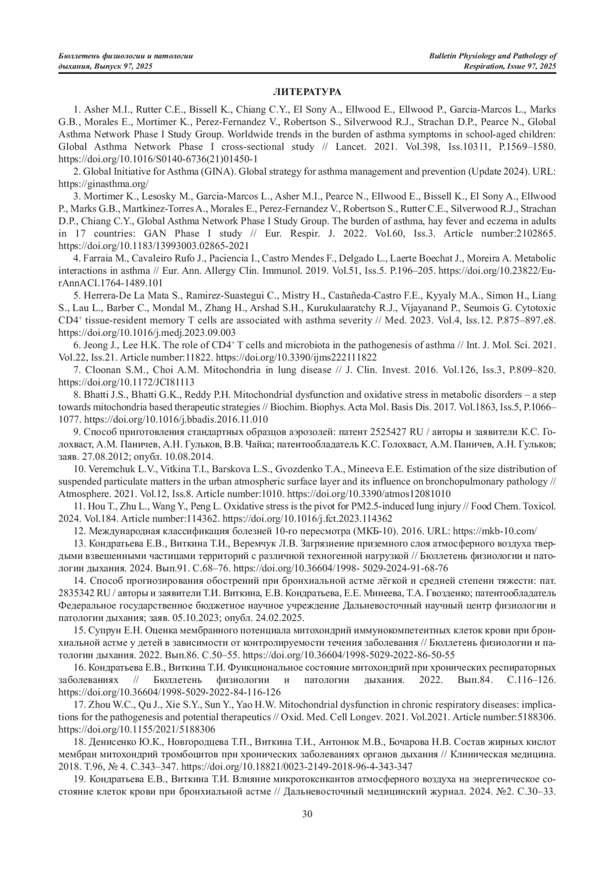 19. Кондратьева Е.В., Виткина Т.И. Влияние микротоксикантов атмосферного воздуха на энергетическое состояние клеток крови при бронхиальной астме // Дальневосточный медицинский журнал. 2024. №2. С.30–33.