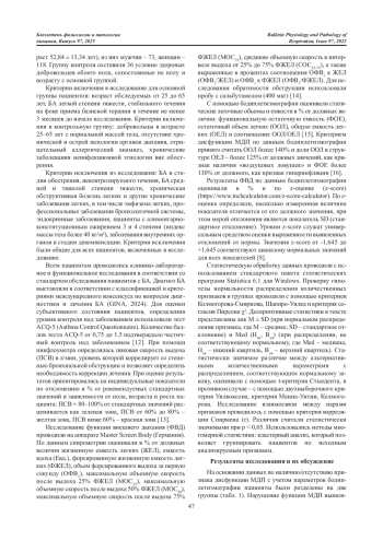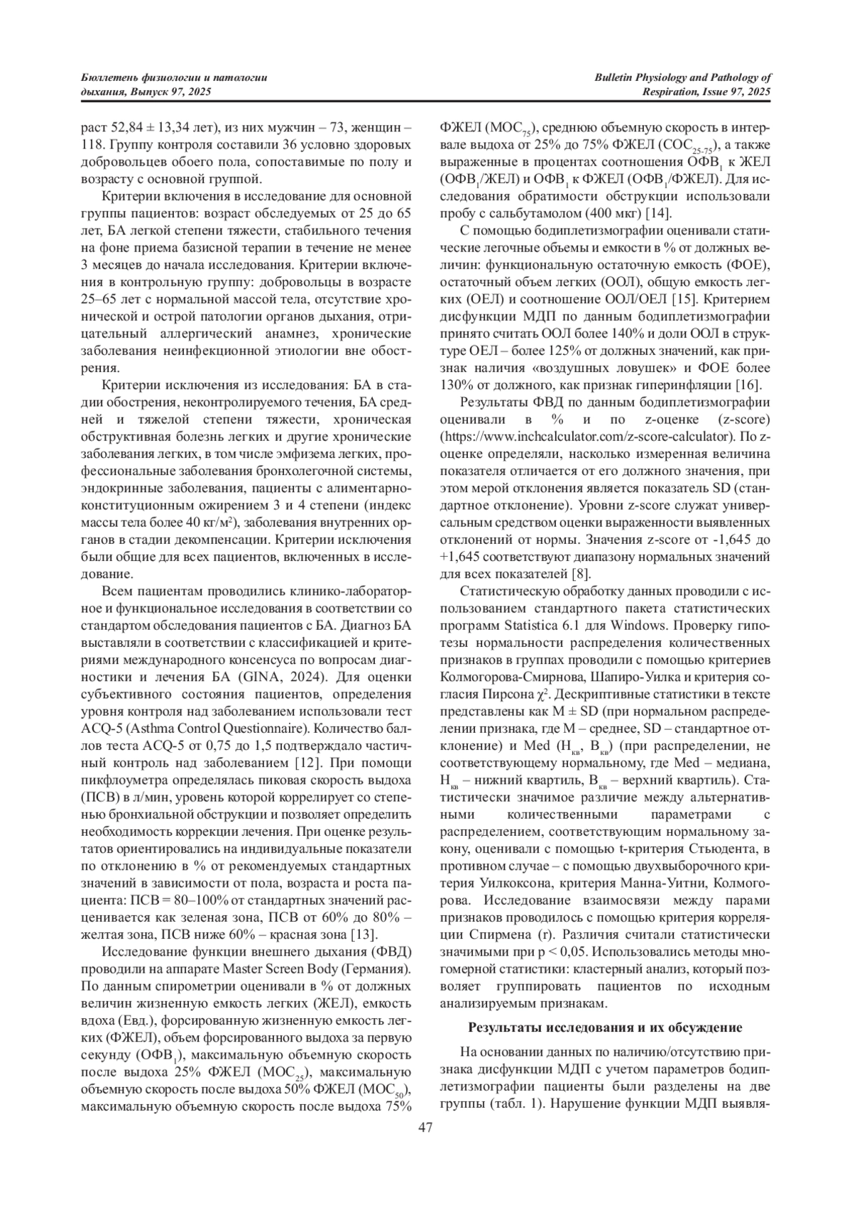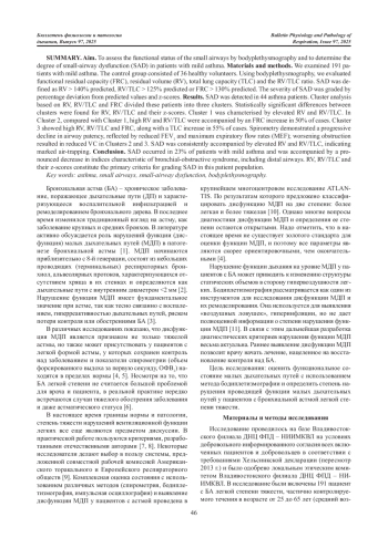 Цель. Оценить функциональное состояние малых дыхательных путей с использованием метода бодиплетизмографии и определить степень нарушения проводящей функции малых дыхательных путей (МДП) у пациентов с бронхиальной астмой (БА) легкой степени тяжести. Материалы и методы. Обследован 191 пациент с легкой БА. Группу контроля составили 36 условно здоровых добровольцев. С помощью бодиплетизмографии оценивали статические легочные объемы и емкости: функциональную остаточную емкость (ФОЕ), остаточный объем легких (ООЛ), общую емкость легких (ОЕЛ), соотношение ООЛ/ОЕЛ. Критерием дисфункции МДП считали ООЛ более 140%, ООЛ/ОЕЛ более 125%, ФОЕ более 130% от должных значений. Для оценки степени дисфункции МДП ориентировались на показатели в % отклонений от должных величин и значение z-score. Результаты. У 44 пациентов с БА выявлялась дисфункция МДП. Пациенты с дисфункцией МДП, с использованием кластерного анализа по параметрам, отражающим состояние МДП (ФОЕ, ООЛ и ООЛ/ОЕЛ) были классифицированы на 3 группы. Были установлены статистически значимые различия между кластерами по уровням ООЛ, ООЛ/ОЕЛ и показателю z-score для ООЛ и ООЛ/ОЕЛ. Для 1 кластера было характерно повышение ООЛ и ООЛ/ОЕЛ. У пациентов во 2-м кластере при сравнении с 1 кластером на фоне высоких уровней ООЛ и ООЛ/ОЕЛ в 50% случаев диагностировалось увеличение ФОЕ. В 3 кластере по сравнению с 1 и 2 кластерами отмечалось увеличение ОЕЛ на фоне высоких показателей ООЛ, ООЛ/ОЕЛ и ФОЕ в 55% случаев. По данным спирометрии установили снижение проходимости дыхательных путей, тестируемой величинами объема форсированного выдоха за первую секунду и максимальных объемных скоростей выдоха. Нарастание бронхиальной обструкции привело к уменьшению ЖЕЛ во 2 и 3 кластерах. Было показано, что нарушение функции МДП сопровождалось повышением уровней ООЛ, ООЛ/ОЕЛ. Заключение. Дисфункция МДП при легкой БА диагностирована в 23% случаев и сопровождается более выраженным снижением показателей, характерных для бронхобструктивного синдрома, в том числе, на уровне дистальных бронхов, наличием «воздушных ловушек». Установлены показатели, позволяющие определять степень нарушения функции МДП. Основными критериями степени дисфункции МДП у пациентов с БА легкой степени тяжести являются изменения показателей ООЛ, ООЛ/ОЕЛ и степень этих изменений по z-score.