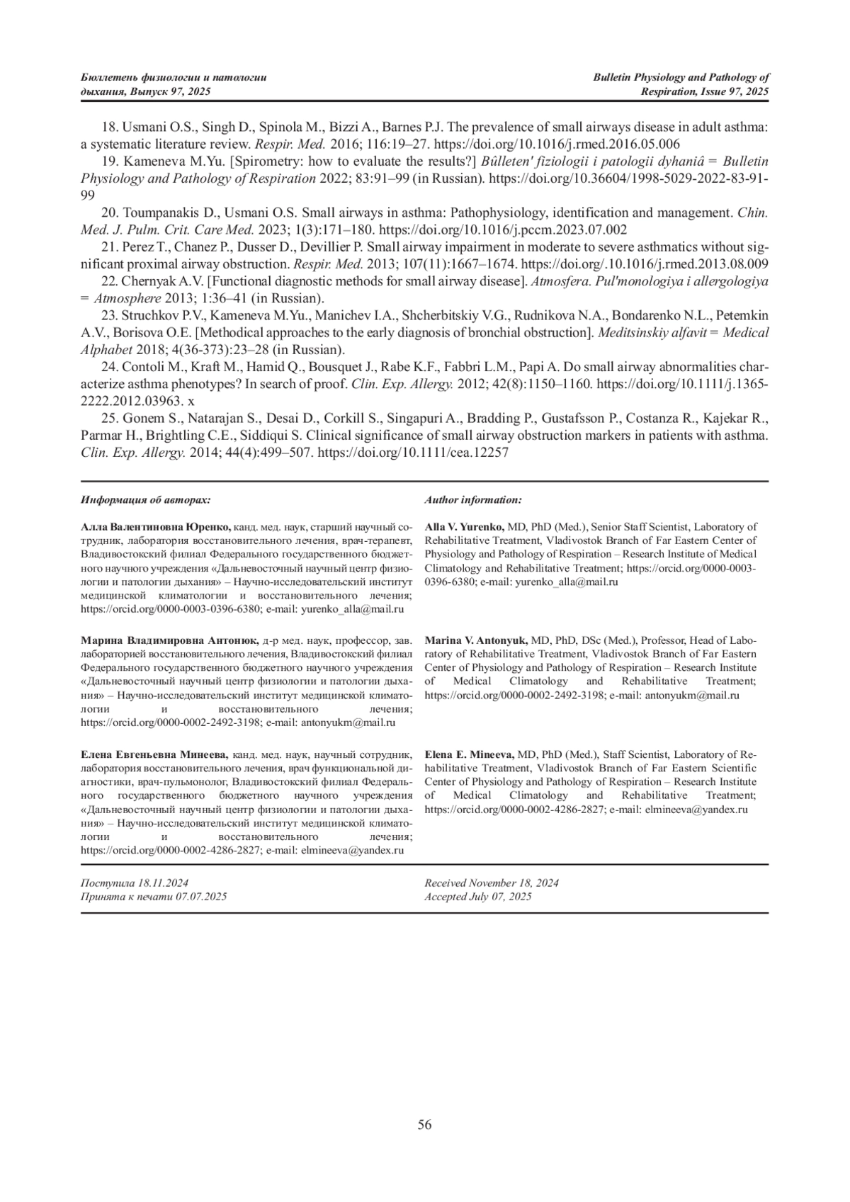17. Минеева Е.Е., Антонюк, М.В., Юренко А.В., Гвозденко Т.А., Уксуменко А.А. Дисфункция малых дыхательных путей и состояние легочной функции при легкой бронхиальной астме // Бюллетень физиологии и патологии дыхания. 2020. Вып. 78. С.76-83. https:/. DOI: 10.36604/1998-5029-2020-78-76-83