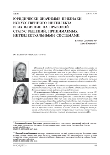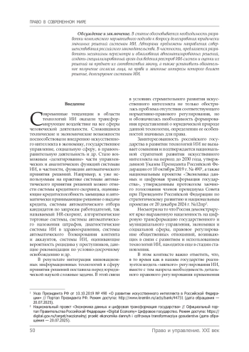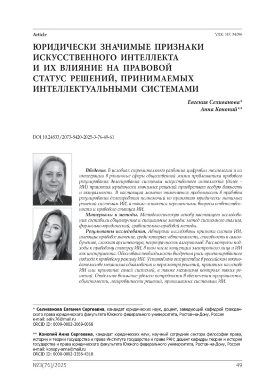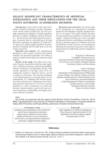 Результаты исследования. Авторами исследованы признаки систем ИИ, имеющие правовое значение, среди которых: автономность, способность к самообучению, сложная архитектура, непрозрачность алгоритмов. Рассмотрены подходы к правовому статусу ИИ, в том числе концепции электронного лица и ИИ как инструмента. Обоснована необходимость внедрения риск-ориентированного подхода к правовому режиму ИИ. Установлено отсутствие в российском законодательстве механизма обжалования и пересмотра решений, принятых на основе ИИ или принятых самой системой, а также механизма контроля таких решений. Отдельное внимание уделено потребности в обеспечении прозрачности, объяснимости, логированности решений, принимаемых системами ИИ.