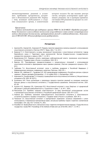 10. Мельникова Е.Н. Проблема «разрыва ответственности» за вред причиненный использованием систем и приложений искусственного интеллекта // Российский юридический журнал. 2024. № 4 (157).
