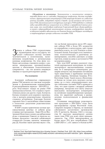 Обсуждение и заключение. Экономические и политические интересы, торговые войны как их следствие, вооруженные конфликты, высокая географическая и функциональная концентрация РЗМ напрямую влияют на глобальные цепочки поставок, побуждают страны к борьбе с целью контроля над источниками РЗМ. Дальнейший рост конкуренции за ресурсы РЗМ приводит к созданию новых производственных мощностей по их добыче и переработке в разных регионах мира, что способствует появлению в перспективе более сбалансированного рынка и формированию многополярной системы международной торговли, ослаблению мировой зависимости от влияния Китая как ведущего поставщика и координирующего центра глобальных поставок РЗМ.