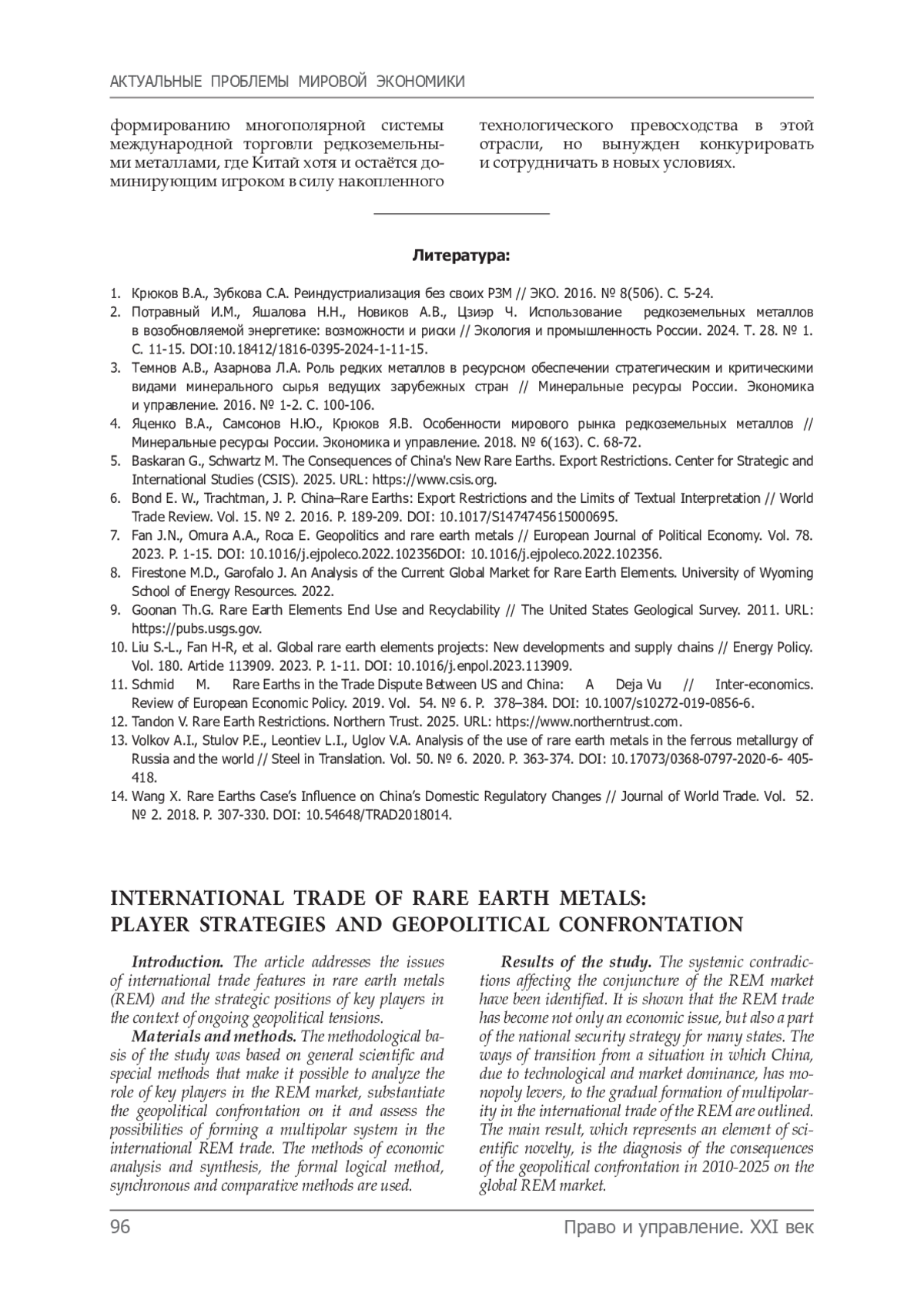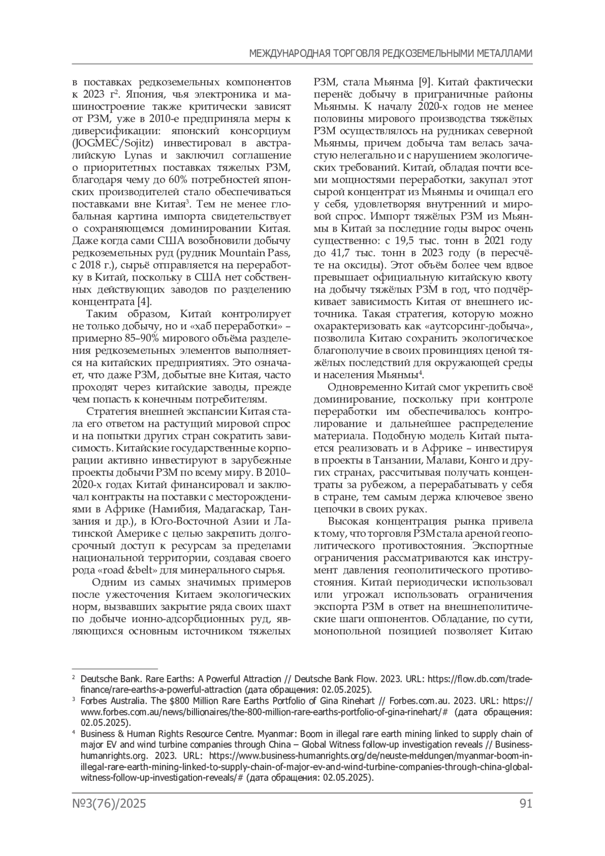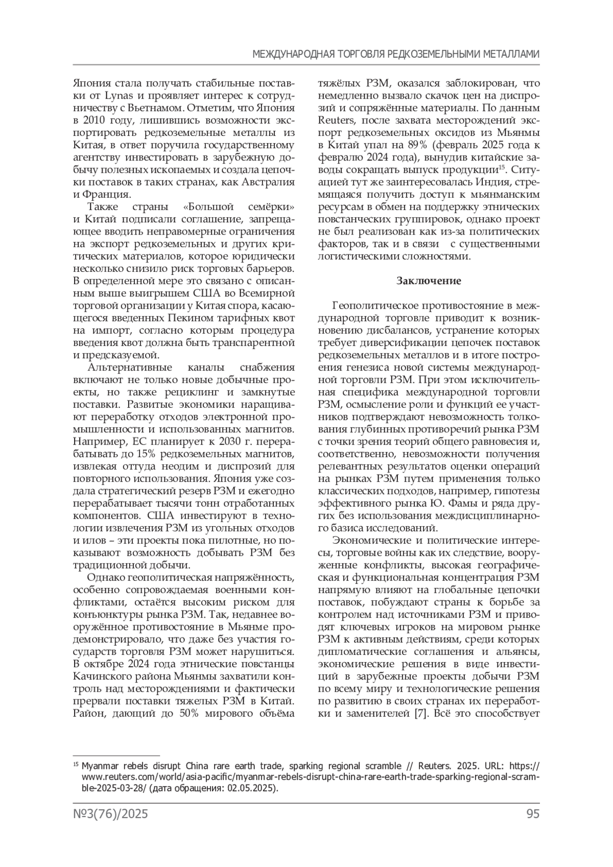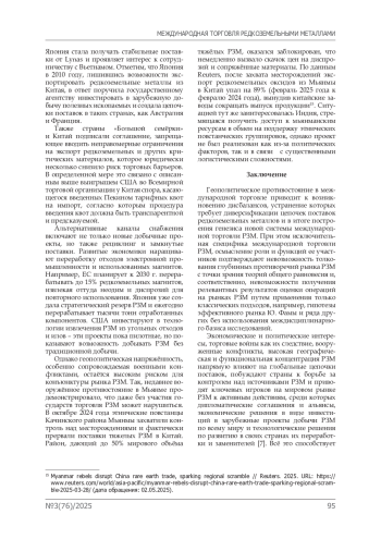7. Fan J.N., Omura A.A., Roca E. Geopolitics and rare earth metals // European Journal of Political Economy. Vol. 78. 2023. P. 1-15. https://doi.org/10.1016/j.ejpoleco.2022.102356DOI: 10.1016/j.ejpoleco.2022.102356.