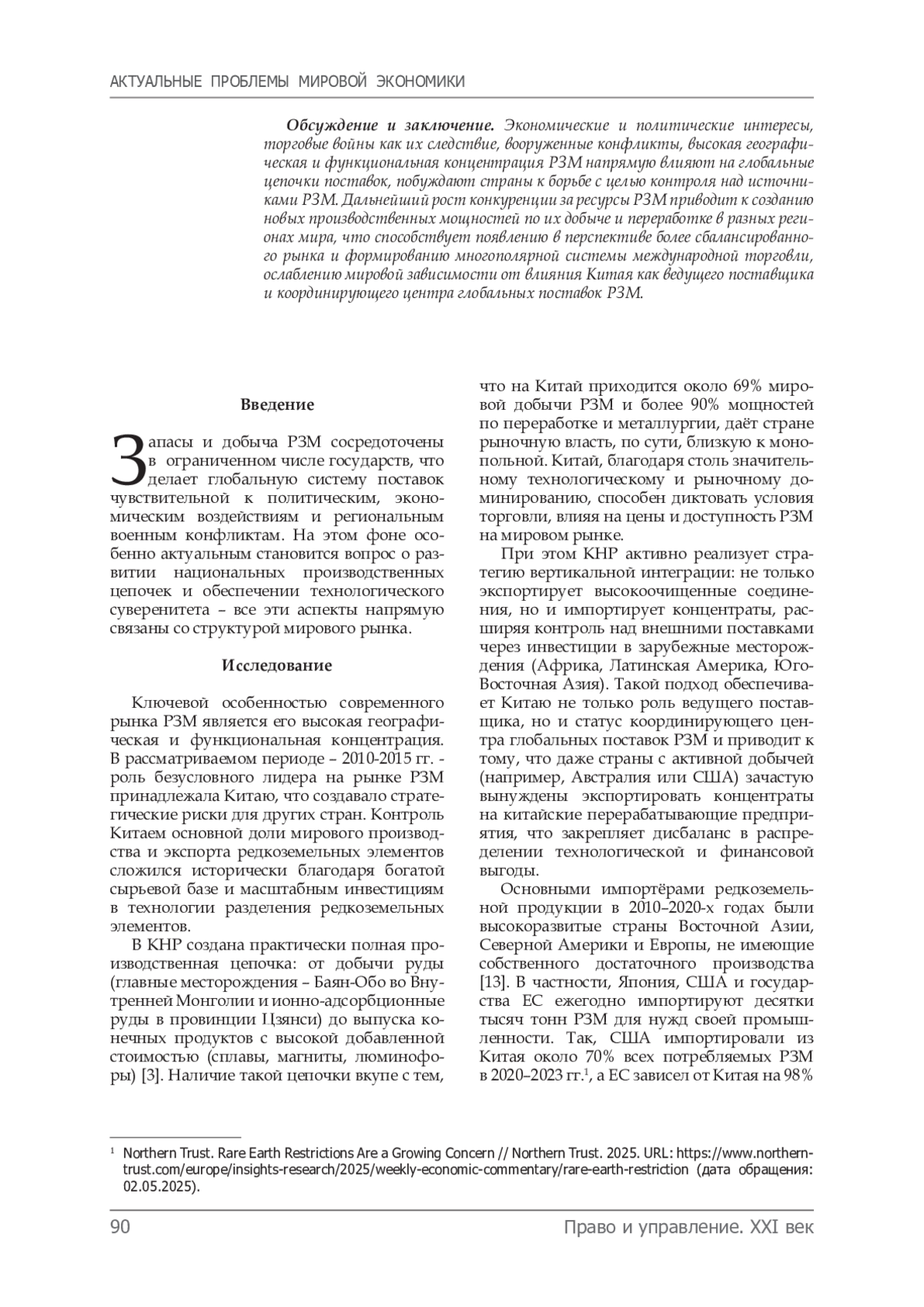 Результаты исследования. Идентифицированы системные противоречия, влияющие на конъюнктуру рынка РЗМ. Показано, что торговля РЗМ стала не только вопросом экономики, но и частью стратегии национальной безопасности для многих государств. Обозначены пути перехода от ситуации, при которой Китай в силу технологического и рыночного доминирования обладает монопольными рычагами, к постепенному формированию многополярности в международной торговле РЗМ. Основной результат, представляющий элемент научной новизны, заключается в диагностике последствий геополитического противостояния в 2010-2025 гг. на мировом рынке РЗМ.