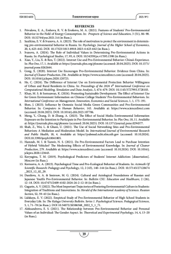 1. Привалова Е. А., Ершова Р. В., Ерофеева М. А. Особенности проэкологичного поведения студентов в области энергопотребления // Перспективы науки и образования. 2021. № 3 (51). С. 86-98. https://doi.org/10.32744/pse.2021.3.6.