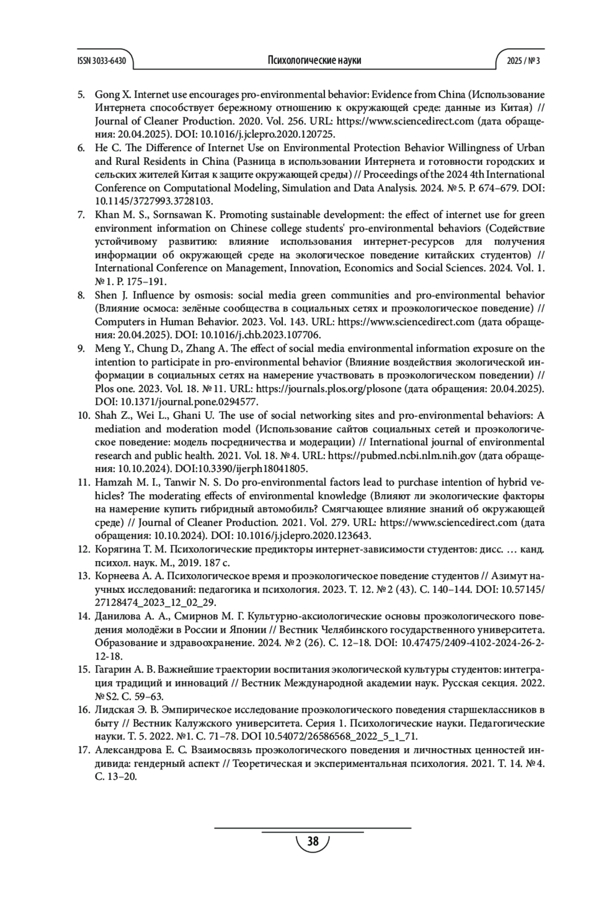 5. Gong X. Internet use encourages pro-environmental behavior: Evidence from China (Использование Интернета способствует бережному отношению к окружающей среде: данные из Китая) // Journal of Cleaner Production. 2020. Vol. 256. URL: https://www.sciencedirect.com (дата обращения: 20.04.2025). https://doi.org/10.1016/j.jclepro.2020.120725.