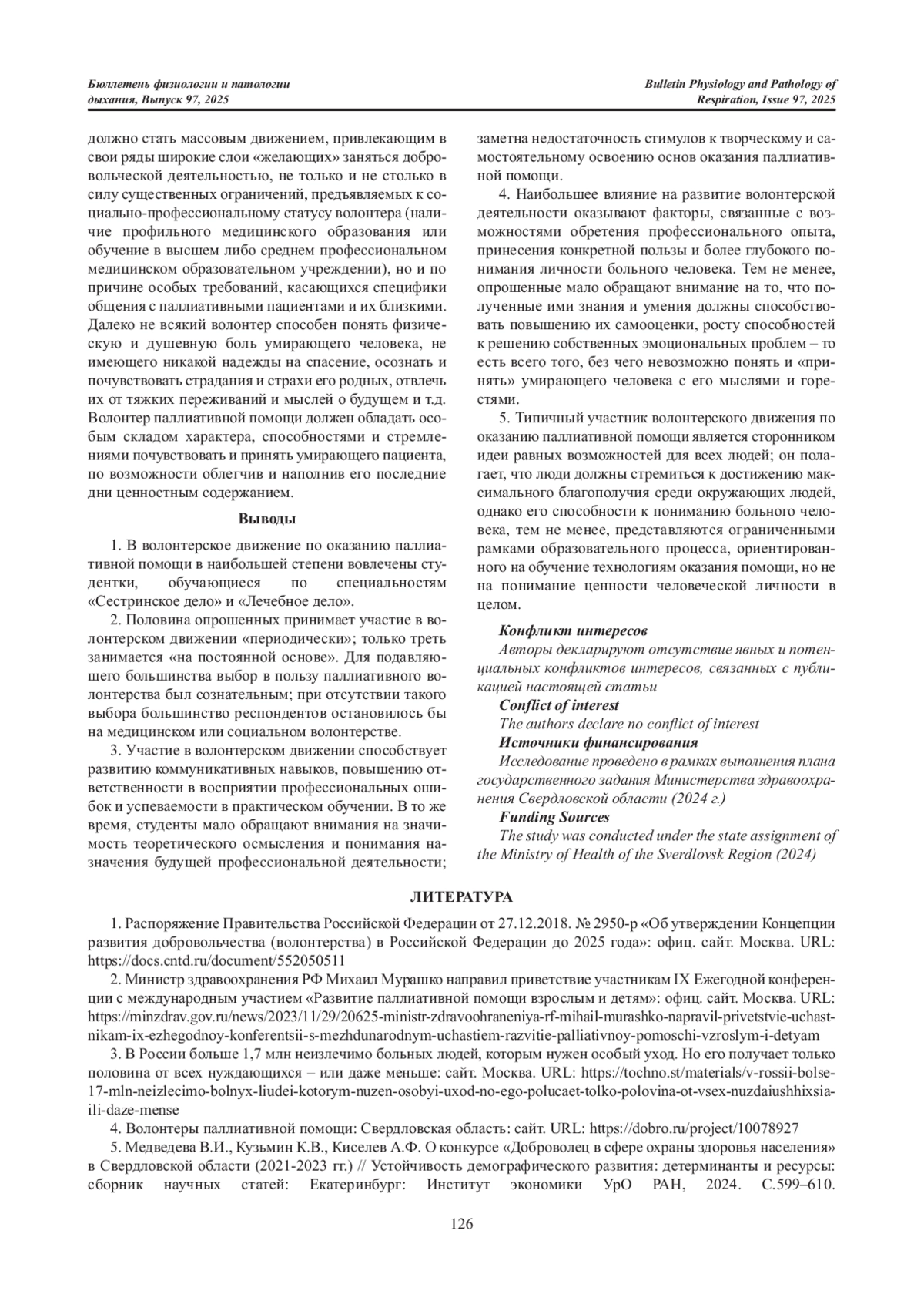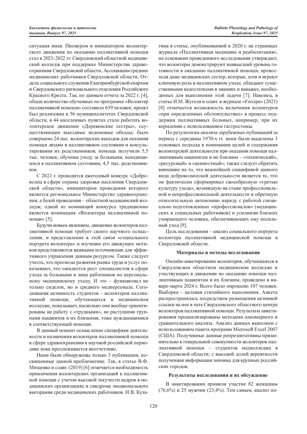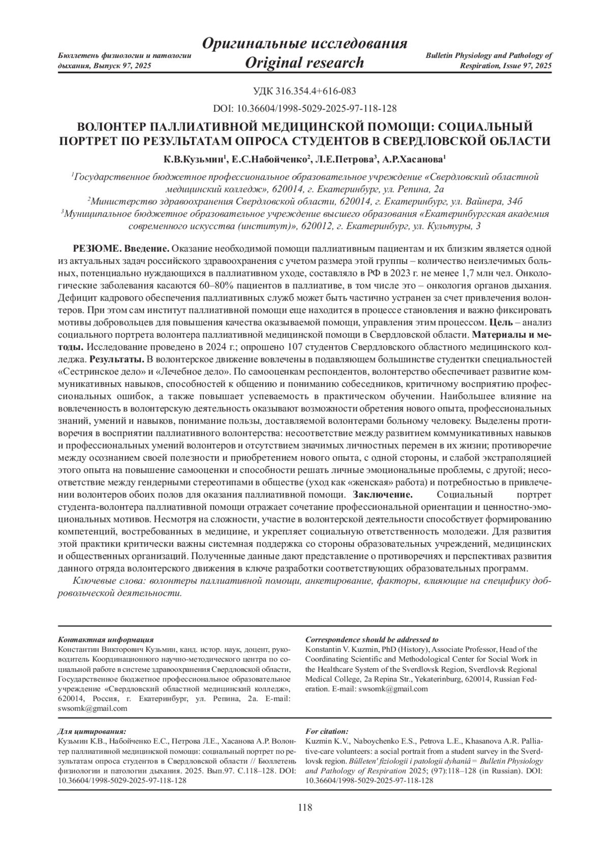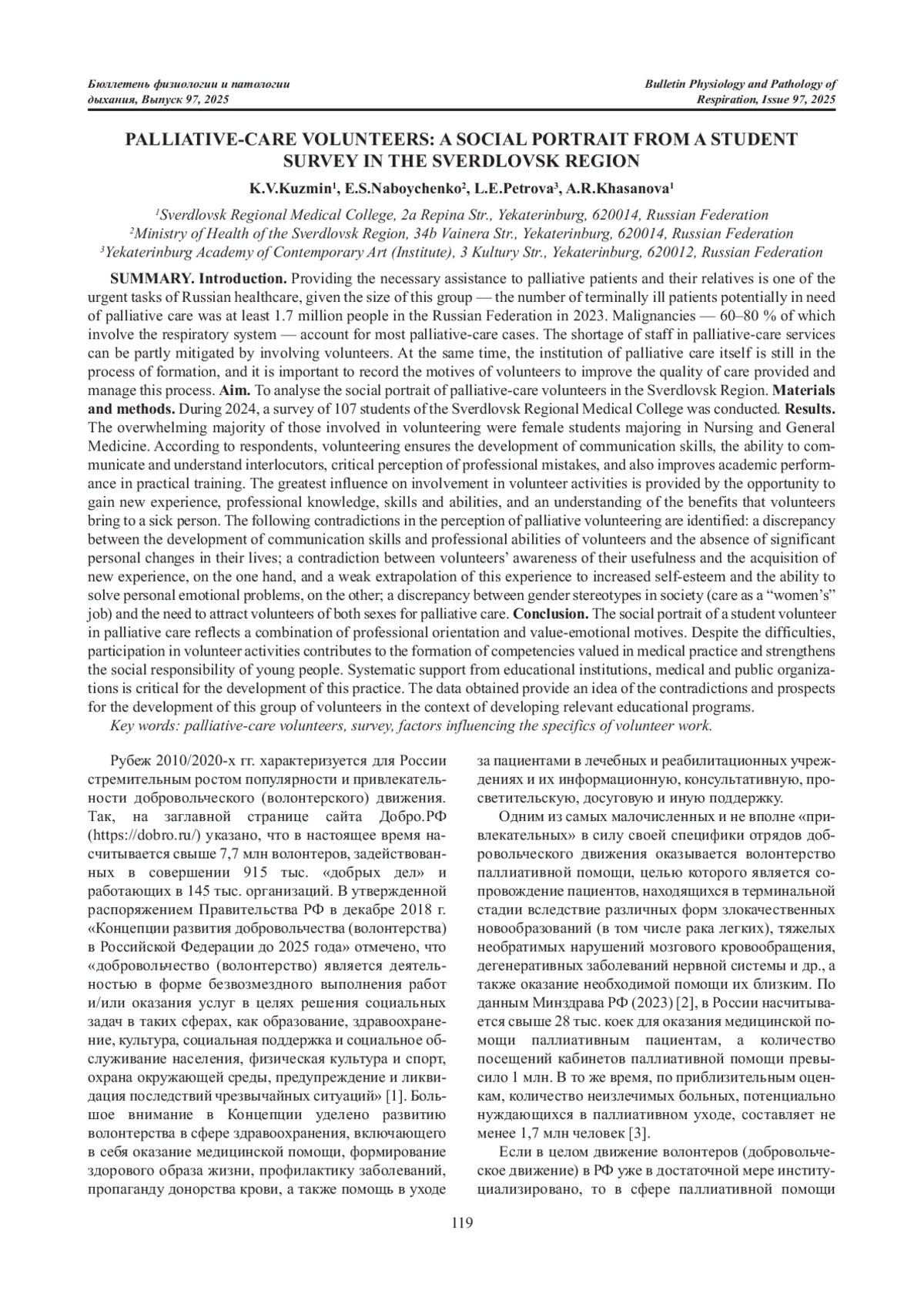 Введение. Оказание необходимой помощи паллиативным пациентам и их близким является одной из актуальных задач российского здравоохранения с учетом размера этой группы – количество неизлечимых больных, потенциально нуждающихся в паллиативном уходе, составляло в РФ в 2023 г. не менее 1,7 млн чел. Онкологические заболевания касаются 60–80% пациентов в паллиативе, в том числе это – онкология органов дыхания. Дефицит кадрового обеспечения паллиативных служб может быть частично устранен за счет привлечения волонтеров. При этом сам институт паллиативной помощи еще находится в процессе становления и важно фиксировать мотивы добровольцев для повышения качества оказываемой помощи, управления этим процессом. Цель – анализ социального портрета волонтера паллиативной медицинской помощи в Свердловской области. Материалы и методы. Исследование проведено в 2024 г.; опрошено 107 студентов Свердловского областного медицинского колледжа. Результаты. В волонтерское движение вовлечены в подавляющем большинстве студентки специальностей «Сестринское дело» и «Лечебное дело». По самооценкам респондентов, волонтерство обеспечивает развитие коммуникативных навыков, способностей к общению и пониманию собеседников, критичному восприятию профессиональных ошибок, а также повышает успеваемость в практическом обучении. Наибольшее влияние на вовлеченность в волонтерскую деятельность оказывают возможности обретения нового опыта, профессиональных знаний, умений и навыков, понимание пользы, доставляемой волонтерами больному человеку. Выделены противоречия в восприятии паллиативного волонтерства: несоответствие между развитием коммуникативных навыков и профессиональных умений волонтеров и отсутствием значимых личностных перемен в их жизни; противоречие между осознанием своей полезности и приобретением нового опыта, с одной стороны, и слабой экстраполяцией этого опыта на повышение самооценки и способности решать личные эмоциональные проблемы, с другой; несоответствие между гендерными стереотипами в обществе (уход как «женская» работа) и потребностью в привлечении волонтеров обоих полов для оказания паллиативной помощи. Заключение. Социальный портрет студента-волонтера паллиативной помощи отражает сочетание профессиональной ориентации и ценностно-эмоциональных мотивов. Несмотря на сложности, участие в волонтерской деятельности способствует формированию компетенций, востребованных в медицине, и укрепляет социальную ответственность молодежи. Для развития этой практики критически важны системная поддержка со стороны образовательных учреждений, медицинских и общественных организаций. Полученные данные дают представление о противоречиях и перспективах развития данного отряда волонтерского движения в ключе разработки соответствующих образовательных программ.
