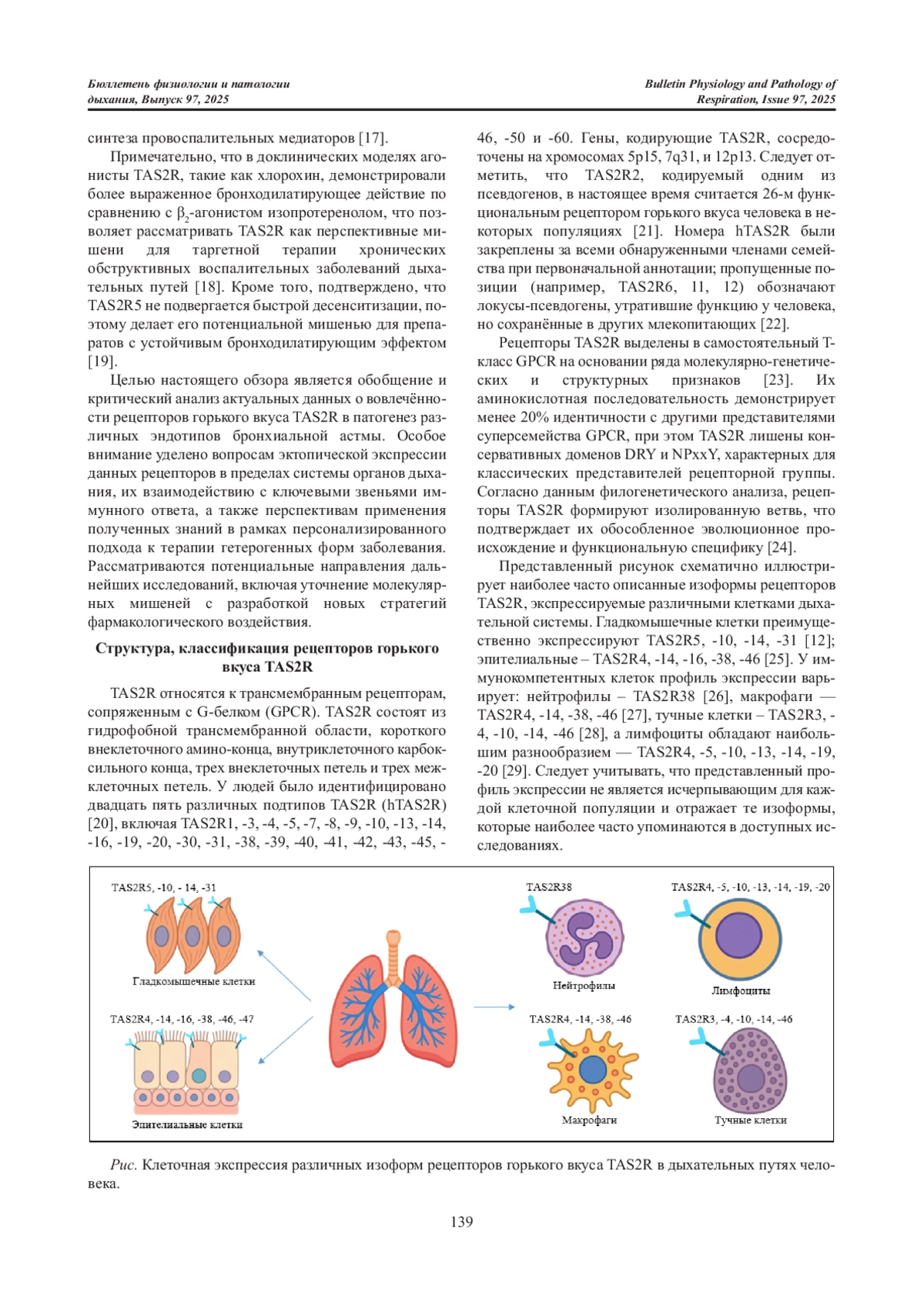 29. Grassin-Delyle S., Salvator H., Mantov N., Abrial C., Brollo M., Faisy C., Naline E., Couderc L.J., Devillier P. Bitter taste receptors (TAS2Rs) in human lung macrophages: receptor expression and inhibitory effects of TAS2R agonists // Front. Physiol. 2019. Vol.10. Article number:1267. DOI: 10.3389/fphys.2019.01267