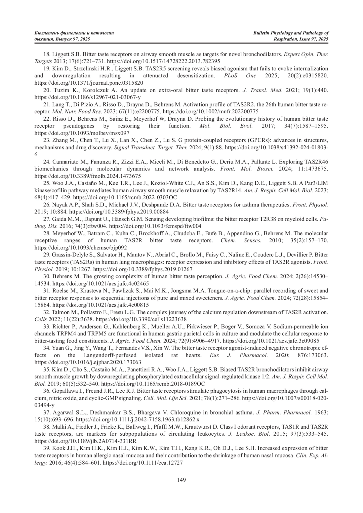 26. Nayak A.P., Shah S.D., Michael J.V., Deshpande D.A. Bitter taste receptors for asthma therapeutics // Front. Physiol. 2019. Vol.10. Article number:884. DOI: 10.3389/fphys.2019.00884