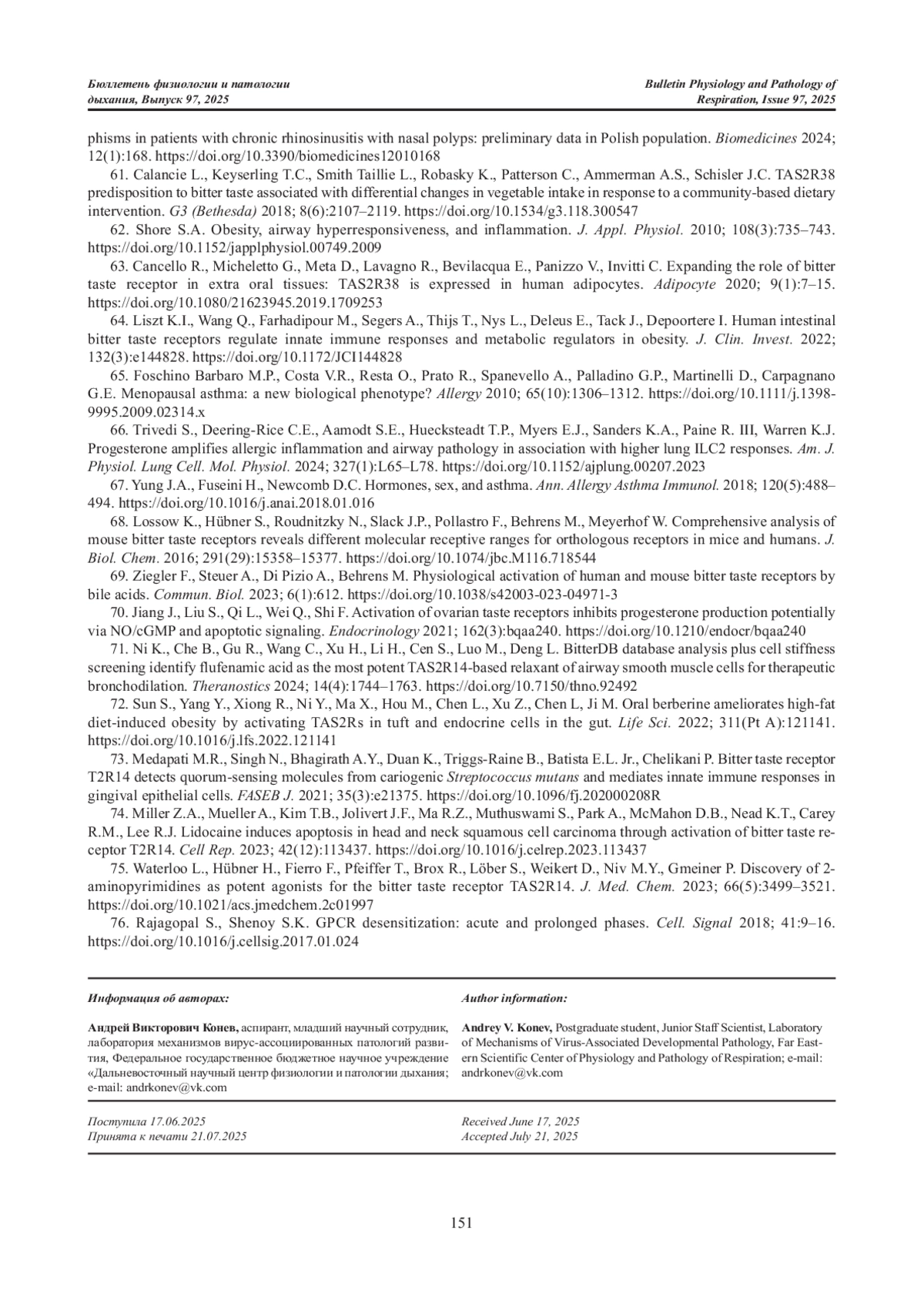 47. Наумов Д.Е., Гассан Д.А., Котова О.О., Шелудько Е.Г., Афанасьева Е.Ю., Конев А.В., Перельман Ю.М. Эффект полиморфизмов гена TAS2R20 на формирование бронхиальной астмы и течение заболевания // Бюллетень физиологии и патологии дыхания. 2024. Вып.94. С.40-50. DOI: 10.36604/1998-5029-2024-94-40-50
