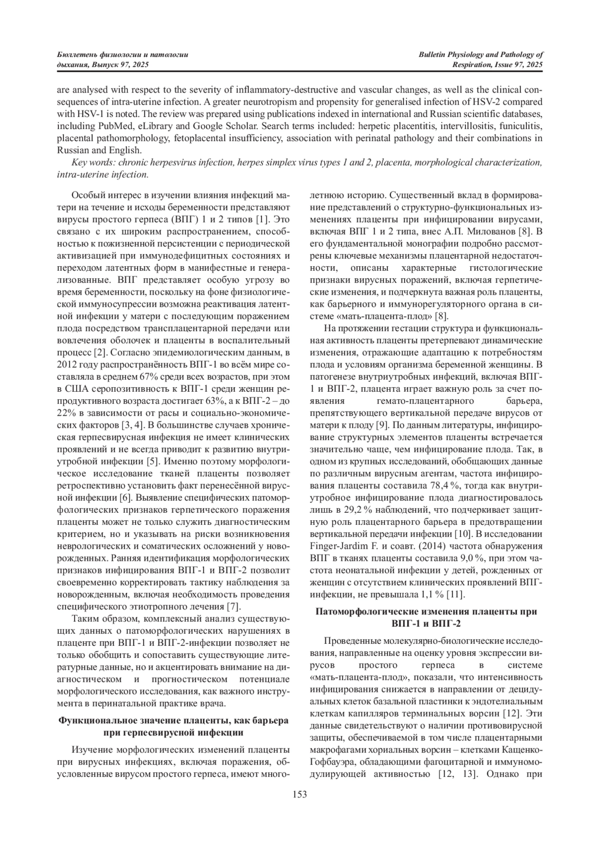 Высокая распространенность герпесвирусной инфекции среди женщин репродуктивного возраста и возможностью латентного течения с последующей реактивацией диктует важность изучения морфологических изменений плаценты, возникающих при инфицировании вирусами простого герпеса (ВПГ) 1 и 2 типов. Статья посвящена морфологической характеристике изменений плаценты при герпесвирусной инфекции и ее связи с развитием перинатальной патологии у плода. Описаны микроскопические признаки, позволяющие заподозрить герпетическое поражение плаценты: хронический виллит, интервиллузит, васкулит, очаговый некроз ворсин, деструкция трофобласта, поражение клеток Кащенко-Гофбауэра и образование гигантских многоядерных клеток с вирусными включениями (ВПГ-клетки Каудри типа В). Проанализированы отличия между ВПГ-1 и ВПГ-2 в зависимости от степени выраженности воспалительно-деструктивных, сосудистых изменений, а также клинических последствий внутриутробного инфицирования. Отмечена большая нейротропность и склонность к генерализации инфекции ВПГ-2 в сравнении с ВПГ-1. В процессе подготовки использовались публикации, размещенные в международных и российских научных базах данных, включая PubMed, eLibrary и Google Scholar. Для поиска использовались ключевые слова: герпетический плацентит, интервиллузит, фунникулит, placental pathomorphology, fetoplacental insufficiency, связь с перинатальной патологией и их сочетания на русском и английском языках.