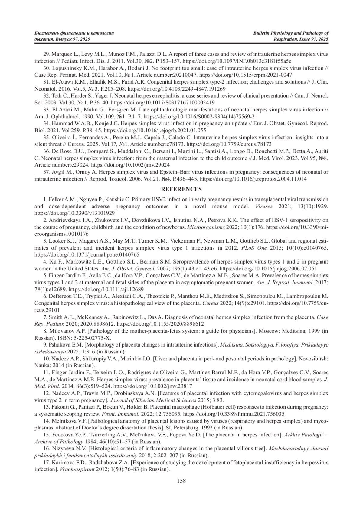 35. Oliveira Í., Fernandes A., Pereira M.J., Capela J., Calado C. Intrauterine herpes simplex virus infection: insights into a silent threat // Cureus. 2025. Vol.17, №1. Article number:e78173. DOI: 10.7759/cureus.78173