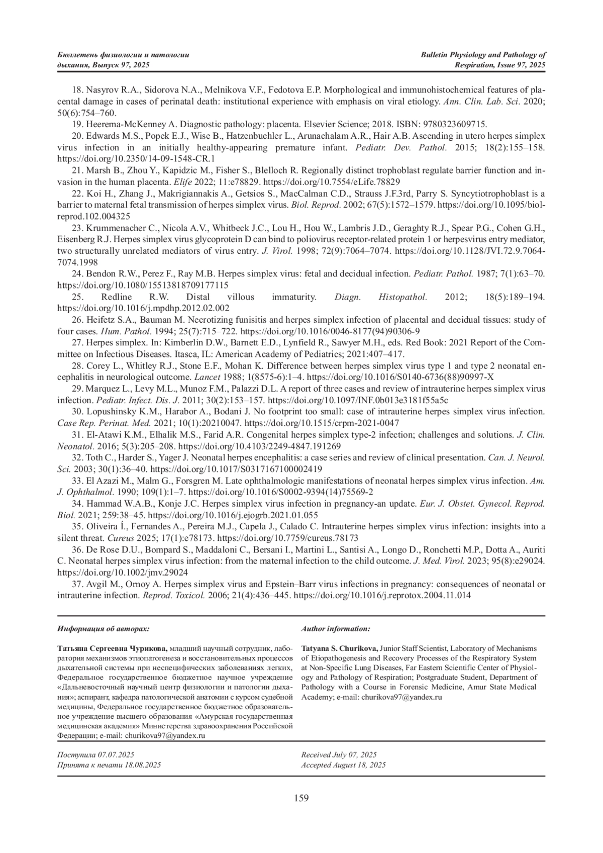 24. Bendon R.W., Perez F., Ray M.B. Herpes simplex virus: fetal and decidual infection // Pediatr. Pathol. 1987. Vol.7, №1. P.63-70. DOI: 10.1080/15513818709177115