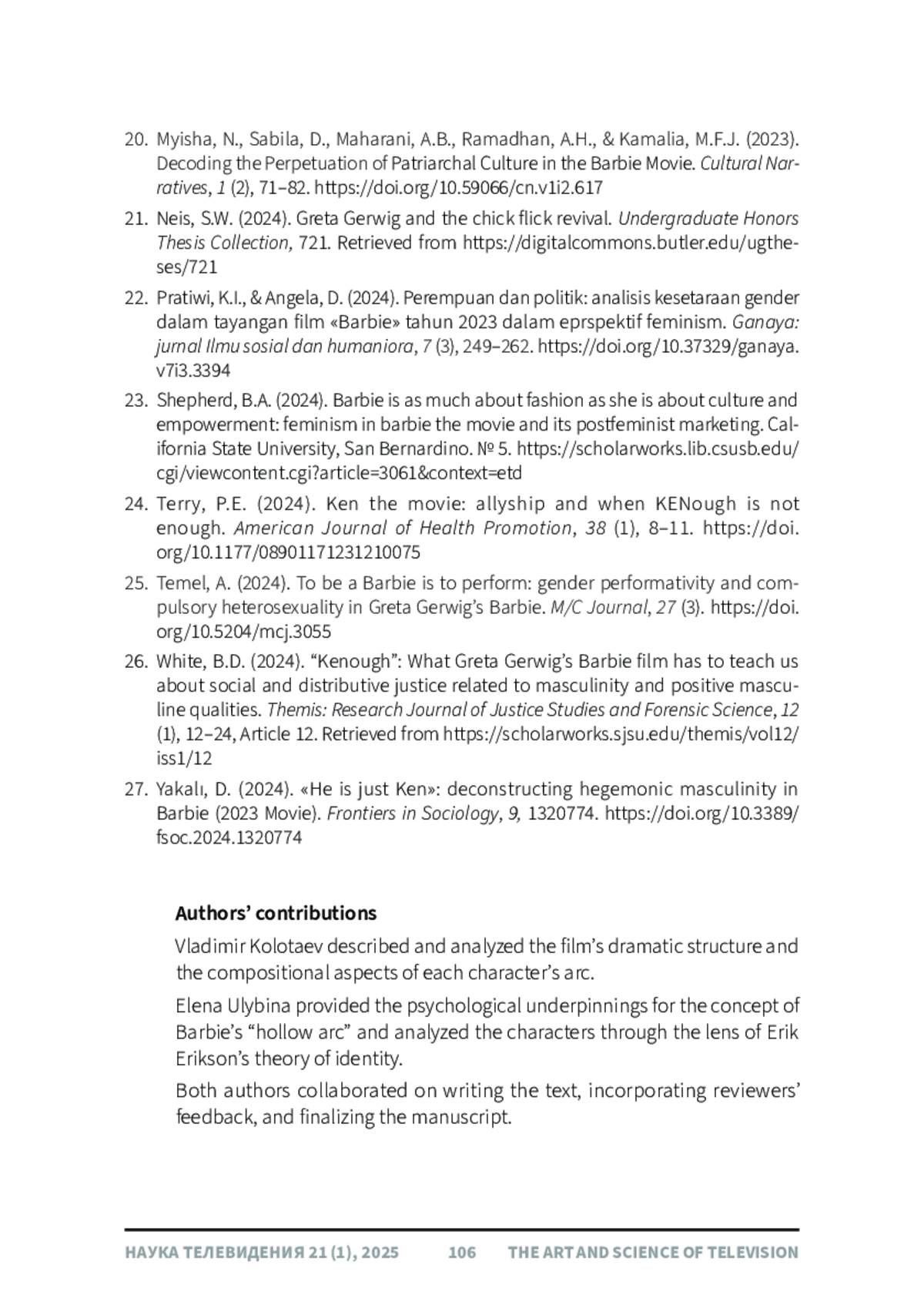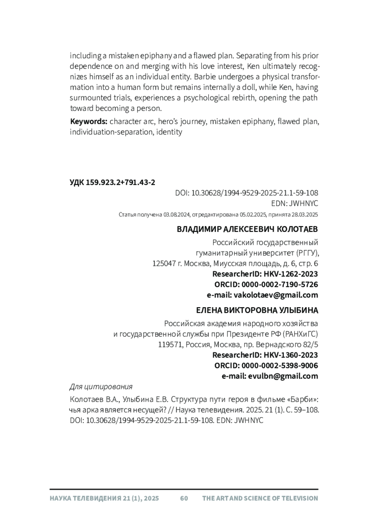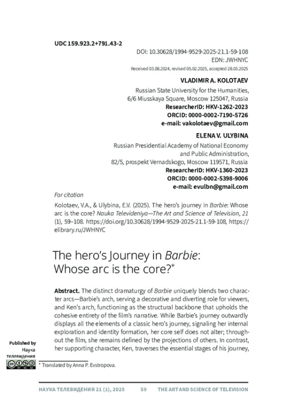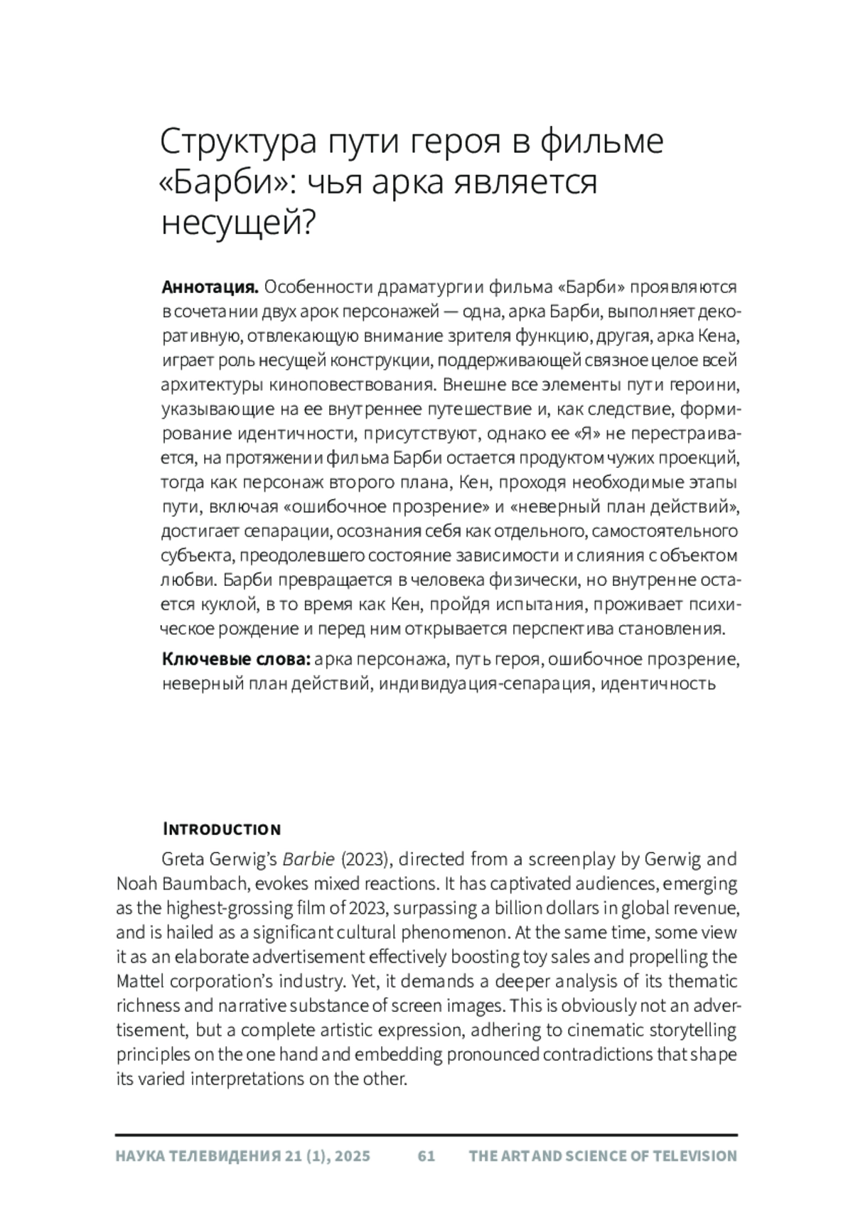 УЛЫБИНА Е. В., КОЛОТАЕВ Ю. Ю. СТРУКТУРА ПУТИ ГЕРОЯ В ФИЛЬМЕ «БАРБИ»: ЧЬЯ АРКА ЯВЛЯЕТСЯ НЕСУЩЕЙ? // НАУКА ТЕЛЕВИДЕНИЯ. 2025. Т. 21 № 1