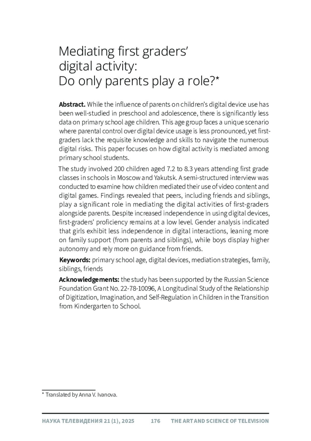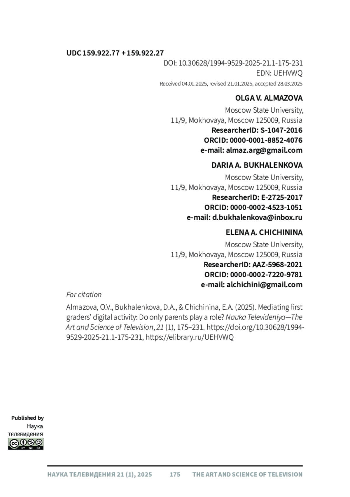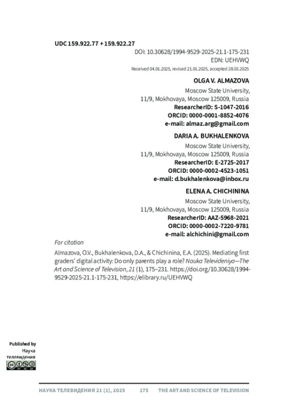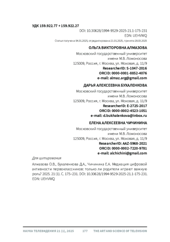 АЛМАЗОВА О. В., БУХАЛЕНКОВА Д. А., ЧИЧИНИНА Е. А. МЕДИАЦИЯ ЦИФРОВОЙ АКТИВНОСТИ ПЕРВОКЛАССНИКОВ: ТОЛЬКО ЛИ РОДИТЕЛИ ИГРАЮТ ВАЖНУЮ РОЛЬ? // НАУКА ТЕЛЕВИДЕНИЯ. 2025. Т. 21 № 1