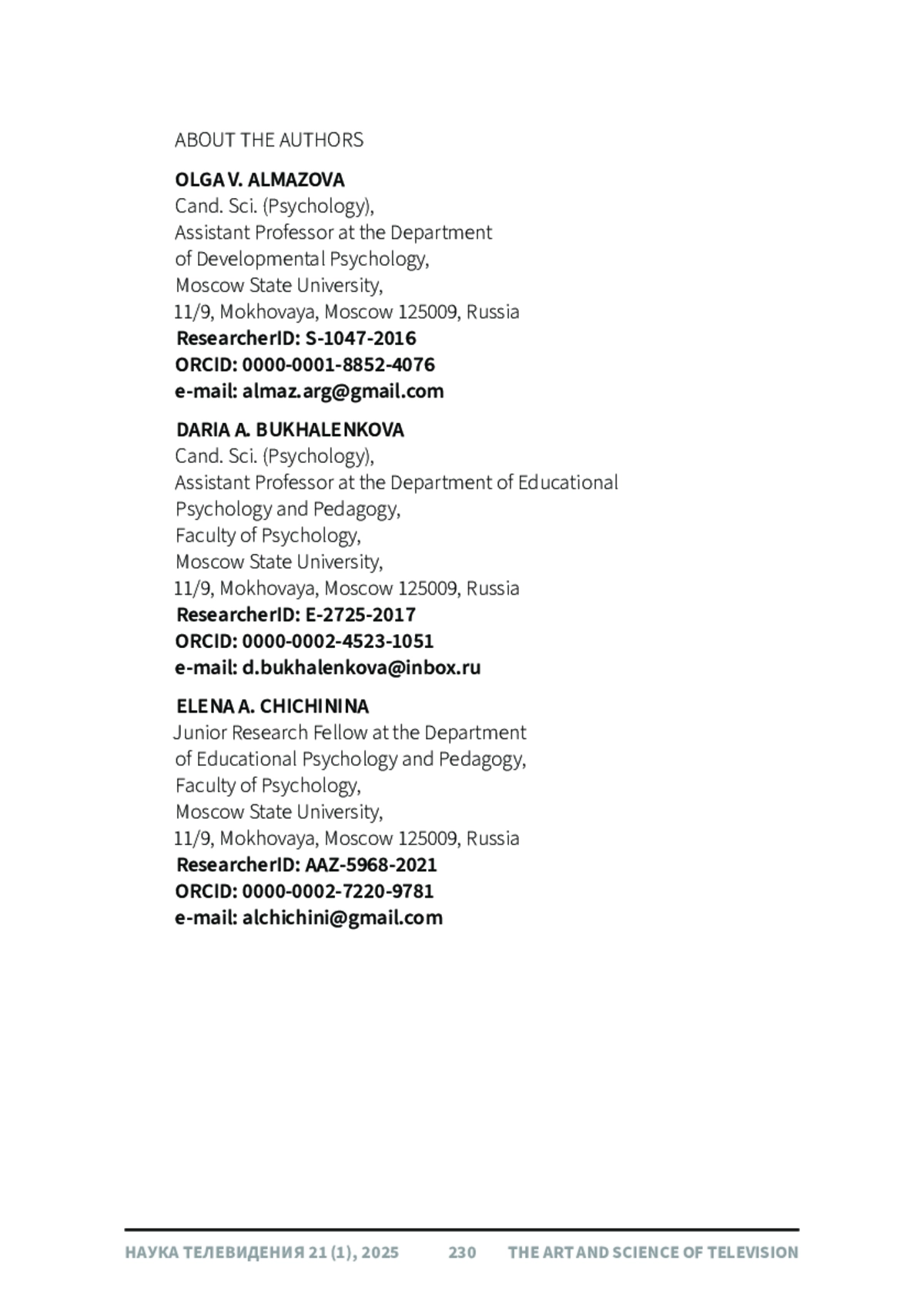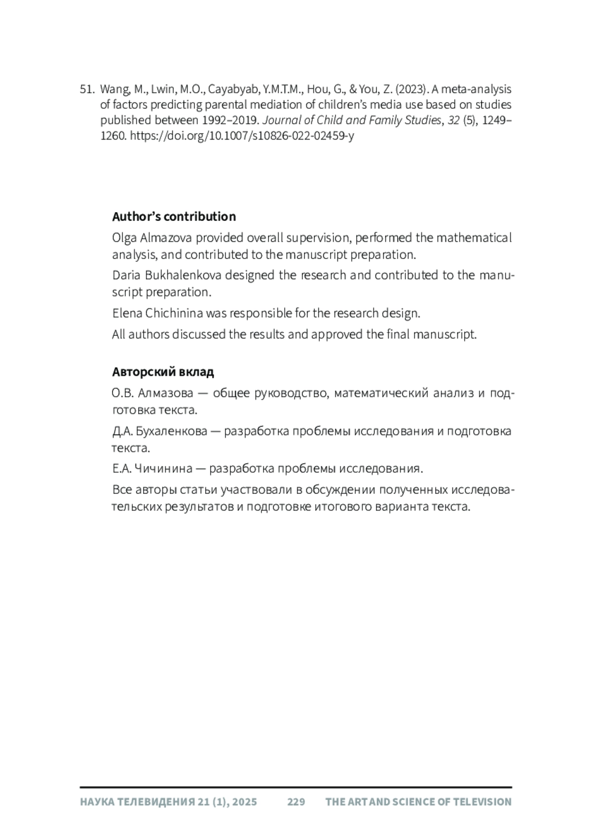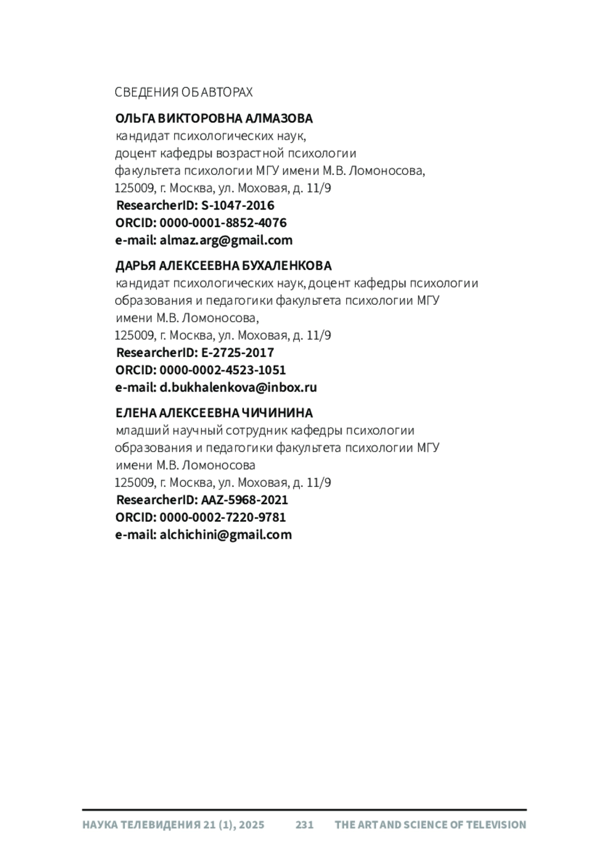 АЛМАЗОВА О. В., БУХАЛЕНКОВА Д. А., ЧИЧИНИНА Е. А. МЕДИАЦИЯ ЦИФРОВОЙ АКТИВНОСТИ ПЕРВОКЛАССНИКОВ: ТОЛЬКО ЛИ РОДИТЕЛИ ИГРАЮТ ВАЖНУЮ РОЛЬ? // НАУКА ТЕЛЕВИДЕНИЯ. 2025. Т. 21 № 1