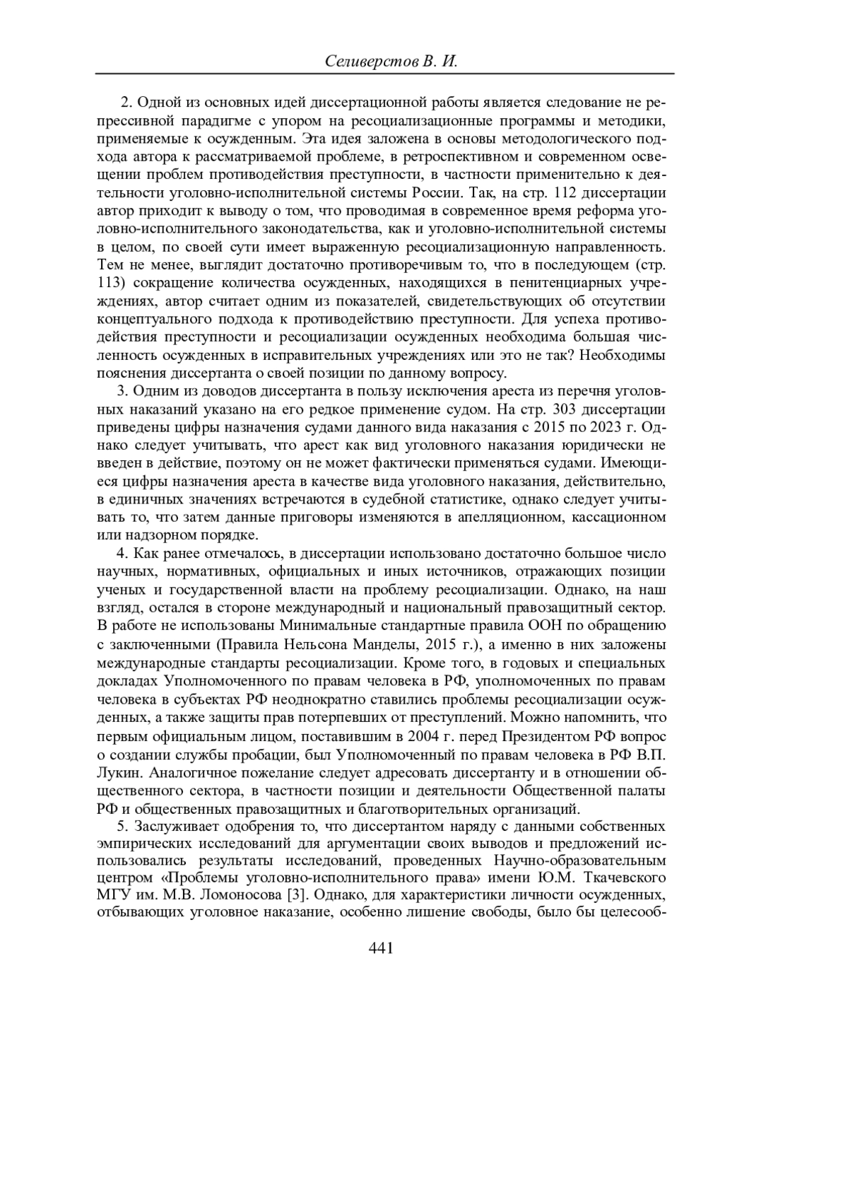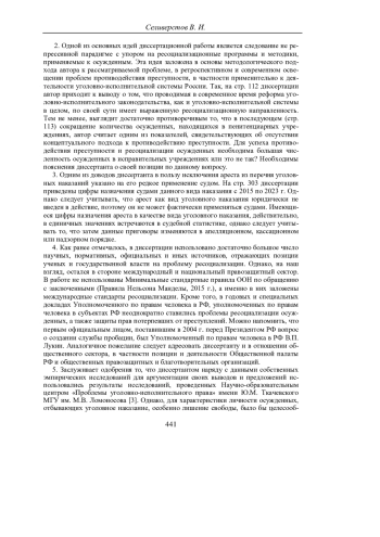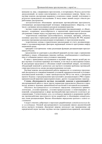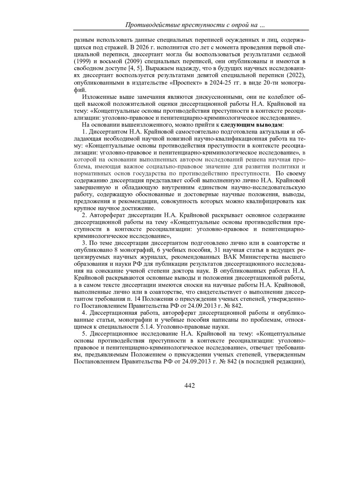 2. Крайнова, Н.А. Концептуальные основы противодействия преступности в контексте ресоциализации: уголовно-правовое и пенитенциарно-криминологическое исследование: автореферат дис.. доктора юридических наук: 5.1.4. / Крайнова Надежда Александровна; [Место защиты: ФГБОУ ВО “Кубанский государственный университет”; Диссовет Д 212.101.XX (24.2.320.07)]. - Москва, 2024. - 42 с. URL: https://rusneb.ru/catalog/000199_000009_013008092/.