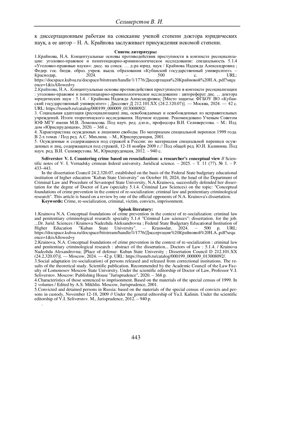 1. Крайнова, Н.А. Концептуальные основы противодействия преступности в контексте ресоциализации: уголовно-правовое и пенитенциарно-криминологическое исследование: специальность 5.1.4 “Уголовно-правовые науки”: дисс. на соиск.. д-ра юрид. наук / Крайнова Надежда Александровна; ФГБОУ ВО “Кубанский государственный университет”. -Краснодар, 2024. - 500 с.