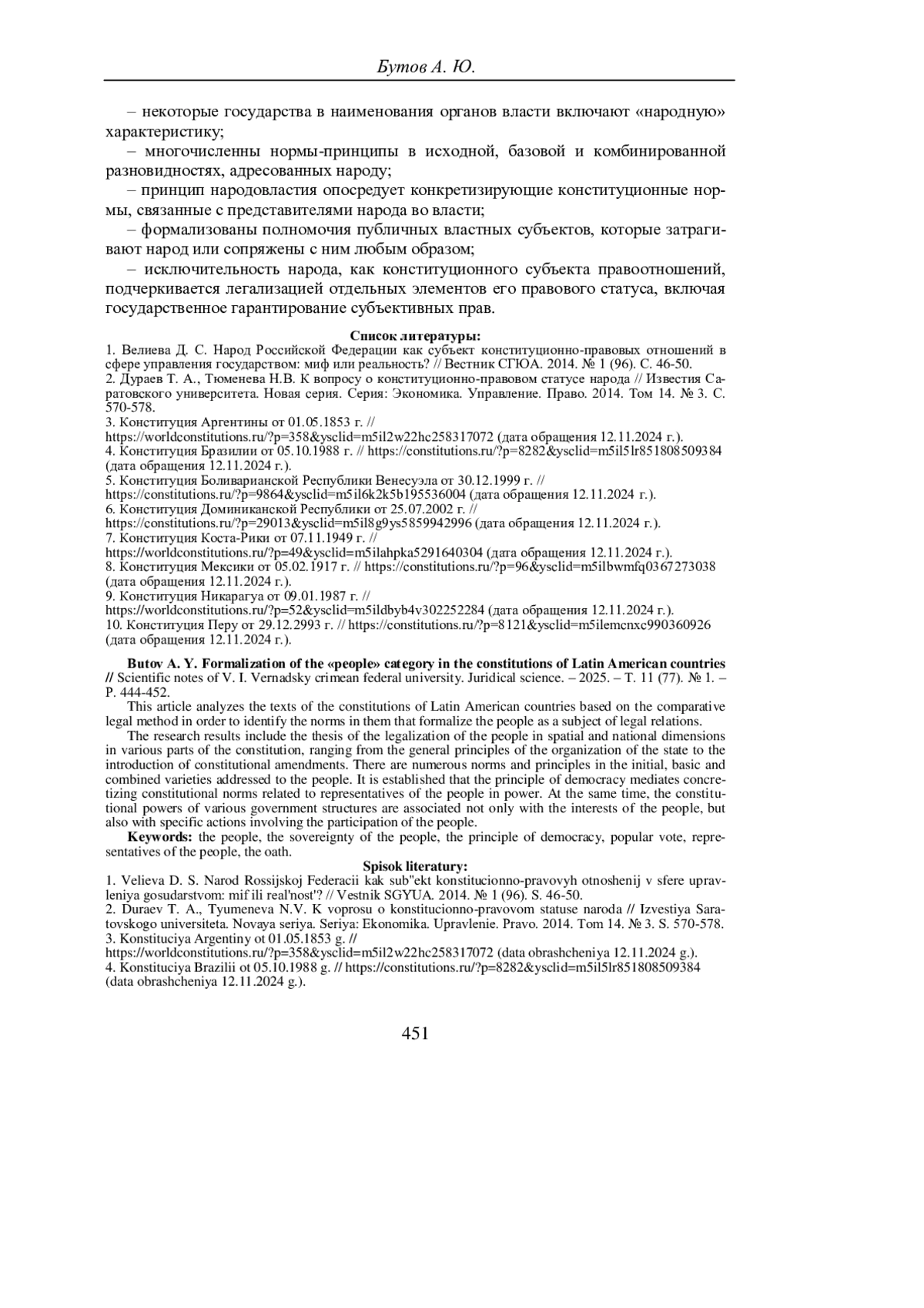 БУТОВ А. Ю. ФОРМАЛИЗАЦИЯ КАТЕГОРИИ «НАРОД» В КОНСТИТУЦИЯХ СТРАН ЛАТИНСКОЙ АМЕРИКИ // УЧЕНЫЕ ЗАПИСКИ КРЫМСКОГО ФЕДЕРАЛЬНОГО УНИВЕРСИТЕТА ИМЕНИ В. И. ВЕРНАДСКОГО. ЮРИДИЧЕСКИЕ НАУКИ. 2025. ТОМ 11(77). №1