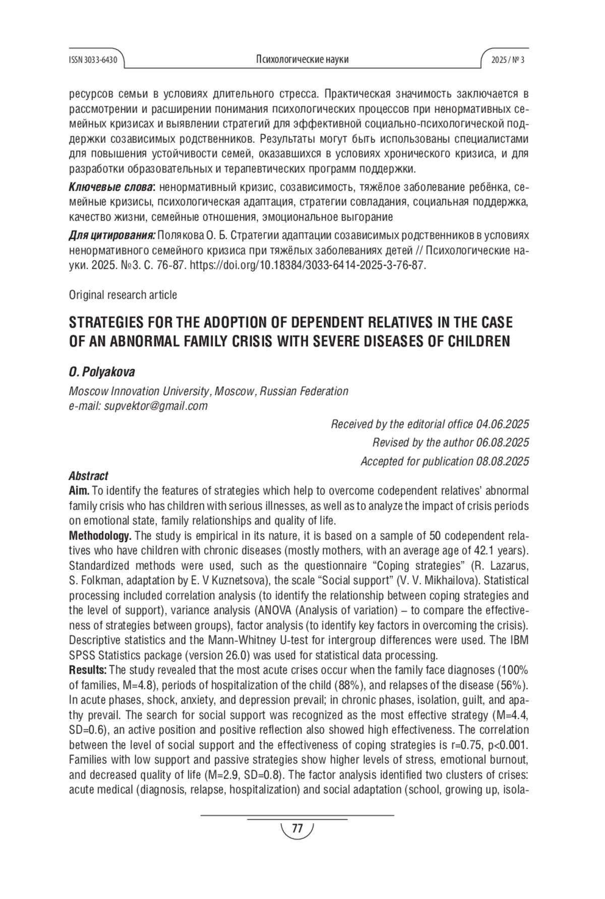 Цель – выявить особенности стратегий преодоления ненормативного семейного кризиса у созависимых родственников детей с тяжёлыми заболеваниями, а также проанализировать влияние кризисных периодов на эмоциональное состояние, внутрисемейные отношения и качество жизни.