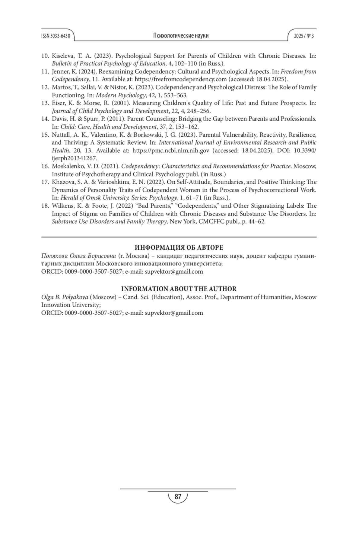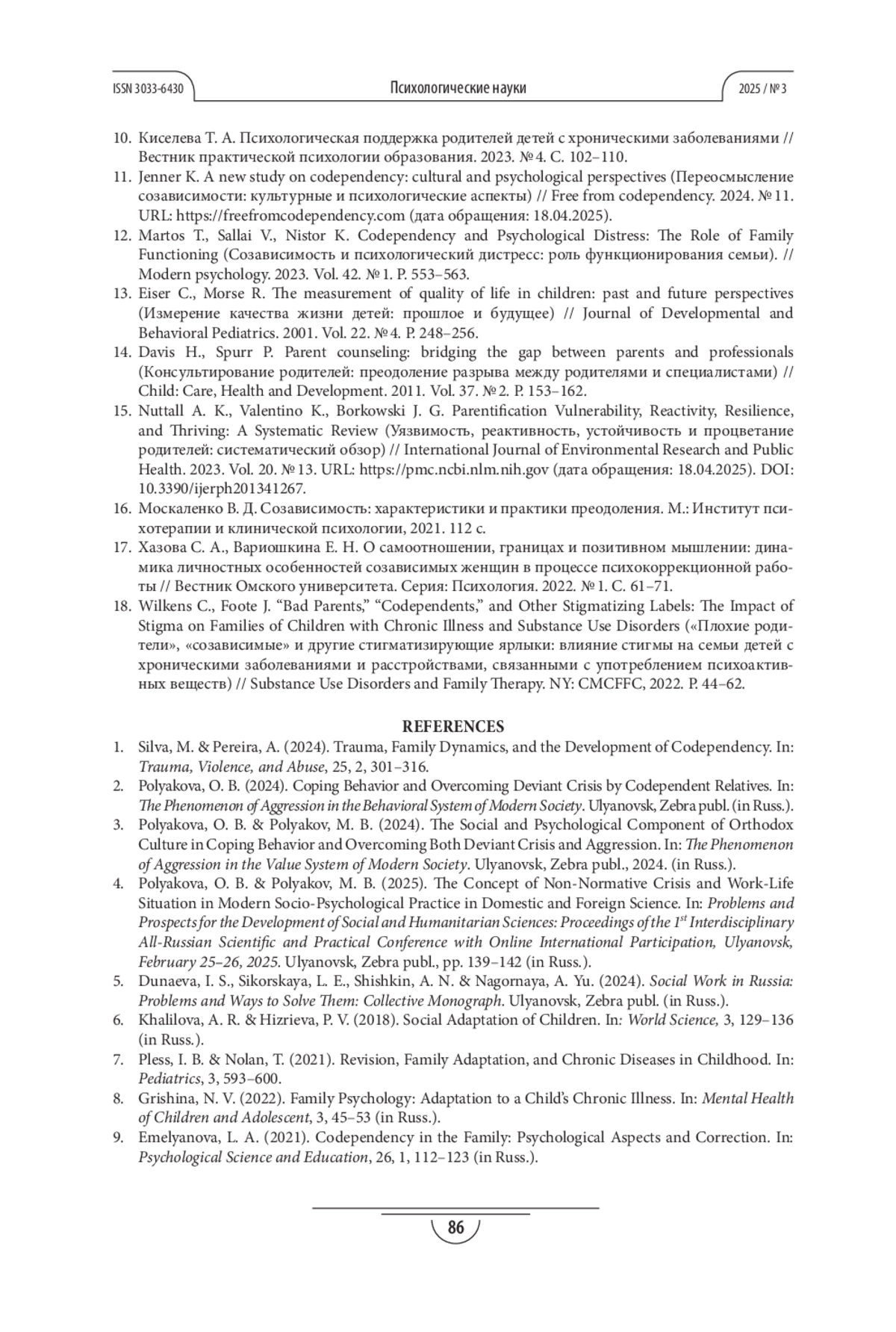 9. Емельянова Л. А. Созависимость в семье: психологические аспекты и коррекция // Психологическая наука и образование. 2021. Т. 26, № 1. С. 112-123.