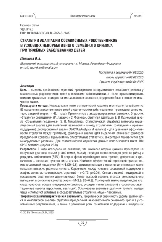 Процедура и методы. Исследование носит эмпирический характер и основано на выборке из 50 созависимых родственников детей с хроническими заболеваниями (преимущественно матери, средний возраст – 42,1 года). Применялись стандартизированные методики: Опросник «Стратегии совладания» (Р. Лазарус и С. Фолкман, стратегия адаптации Е. В. Кузнецова), шкала «Социальная поддержка» (В. В. Михайлова). Статистическая обработка включала корреляционный анализ (для выявления взаимосвязи между стратегиями совладания и уровнем поддержки), дисперсионный анализ (ANOVA (Analysis of variance) – для сравнения эффективности стратегий между группами), факторный анализ (для выделения ключевых факторов преодоления кризиса). Применялись описательные статистики, U-критерий Манна-Уитни для межгрупповых различий. Для статистической обработки данных использовался пакет IBM SPSS Statistics (версия 26.0).