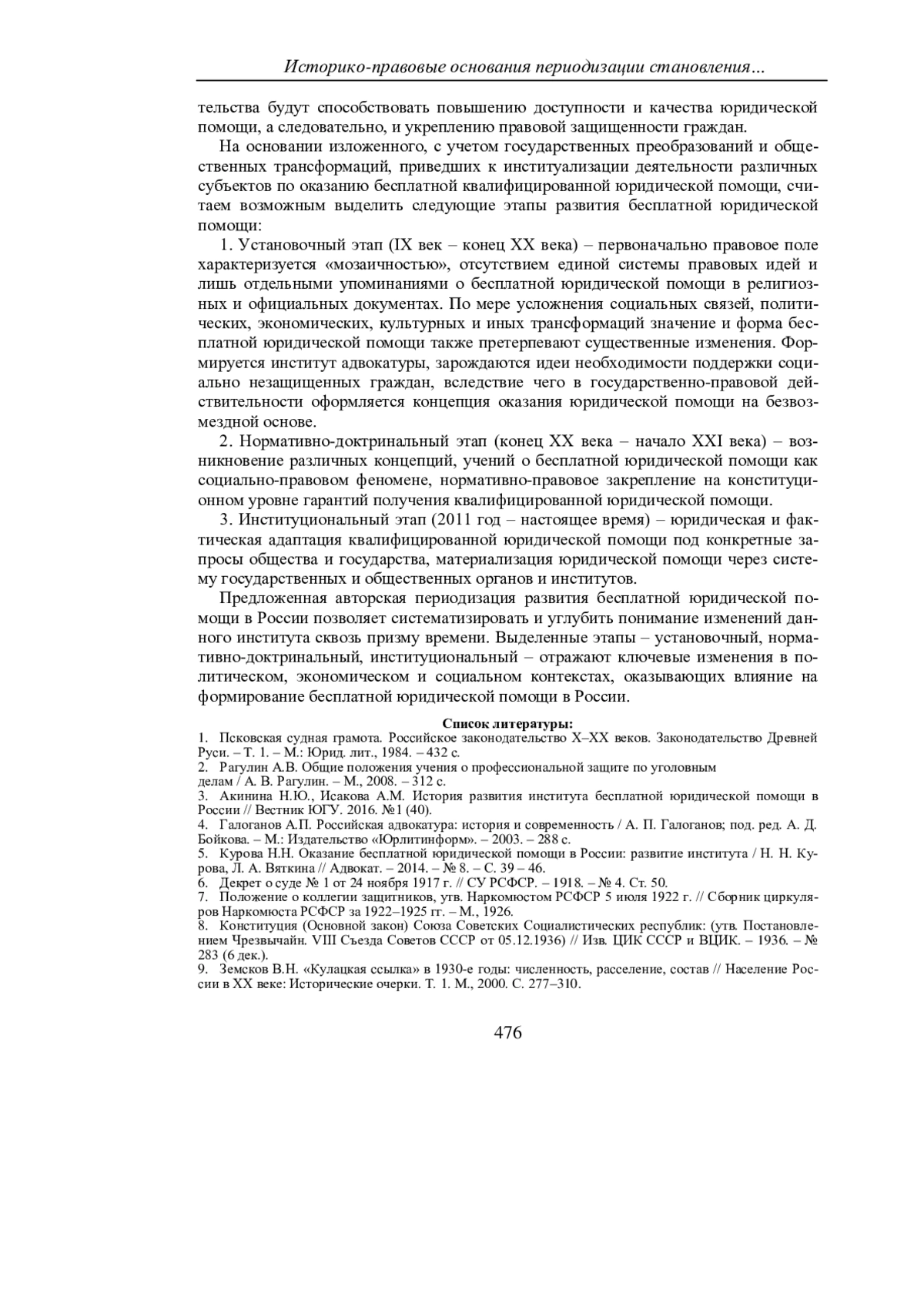 3. Акинина Н.Ю., Исакова А.М. История развития института бесплатной юридической помощи в России // Вестник ЮГУ. 2016. №1 (40).