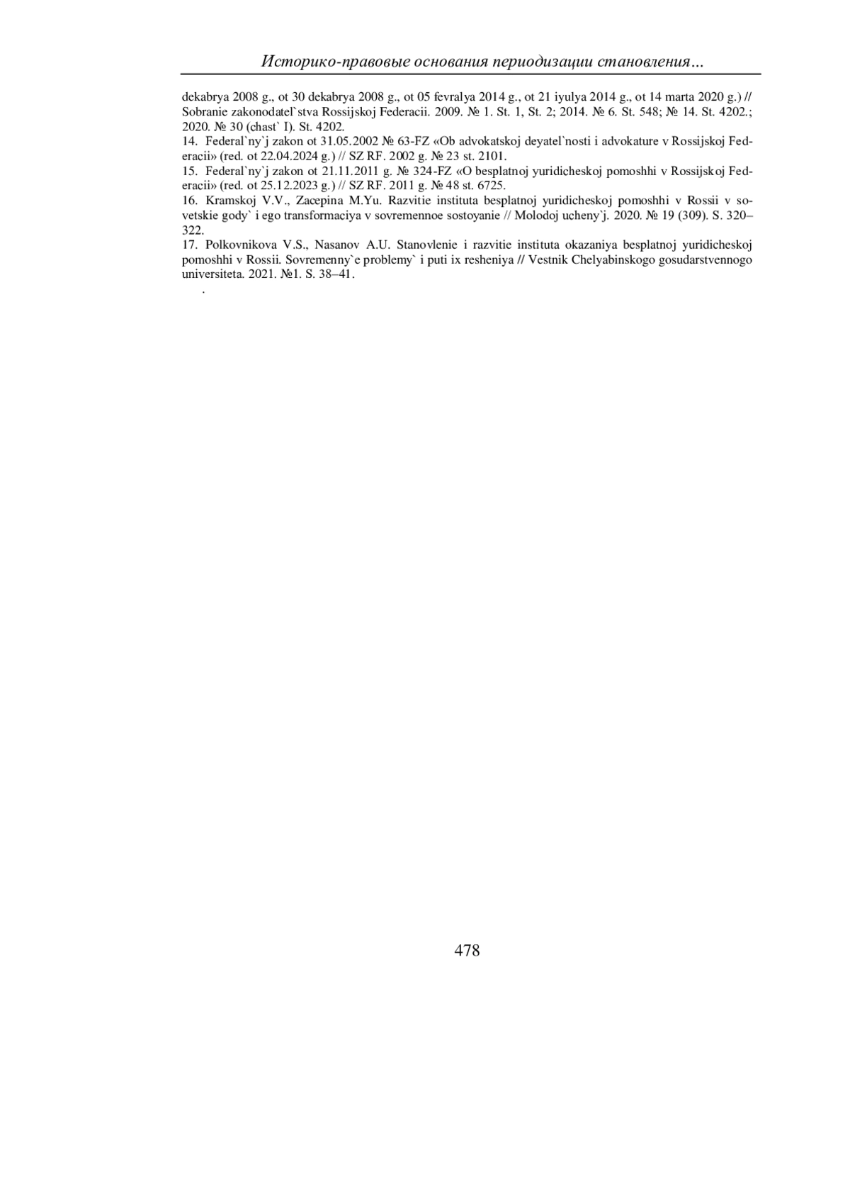 17. Полковникова В.С., Насанов А.У. Становление и развитие института оказания бесплатной юридической помощи в России. Современные проблемы и пути их решения // Вестник Челябинского государственного университета. 2021. №1. С. 38-41.
