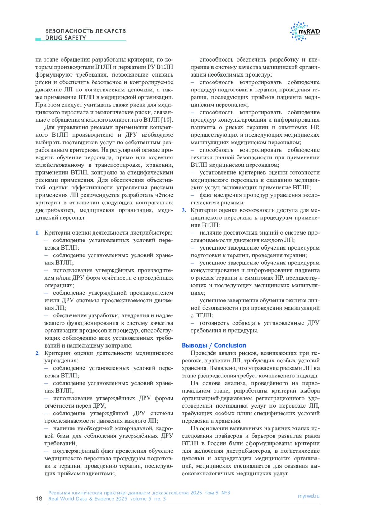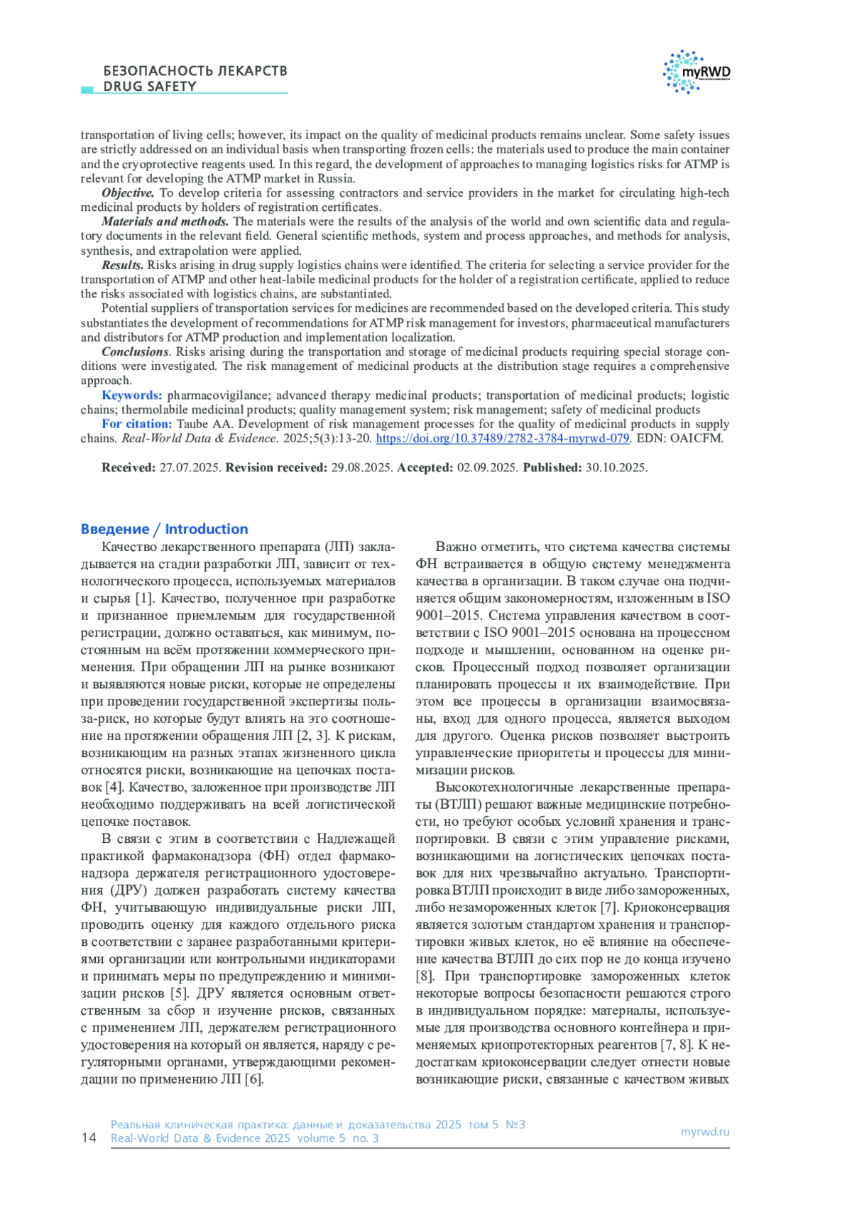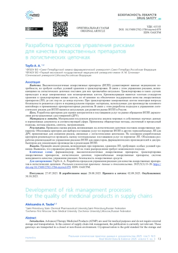 ТАУБЭ А. А. РАЗРАБОТКА ПРОЦЕССОВ УПРАВЛЕНИЯ РИСКАМИ ДЛЯ КАЧЕСТВА ЛЕКАРСТВЕННЫХ ПРЕПАРАТОВ В ЛОГИСТИЧЕСКИХ ЦЕПОЧКАХ // РЕАЛЬНАЯ КЛИНИЧЕСКАЯ ПРАКТИКА: ДАННЫЕ И ДОКАЗАТЕЛЬСТВА. 2025. № 3, ТОМ 5