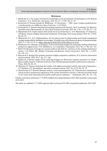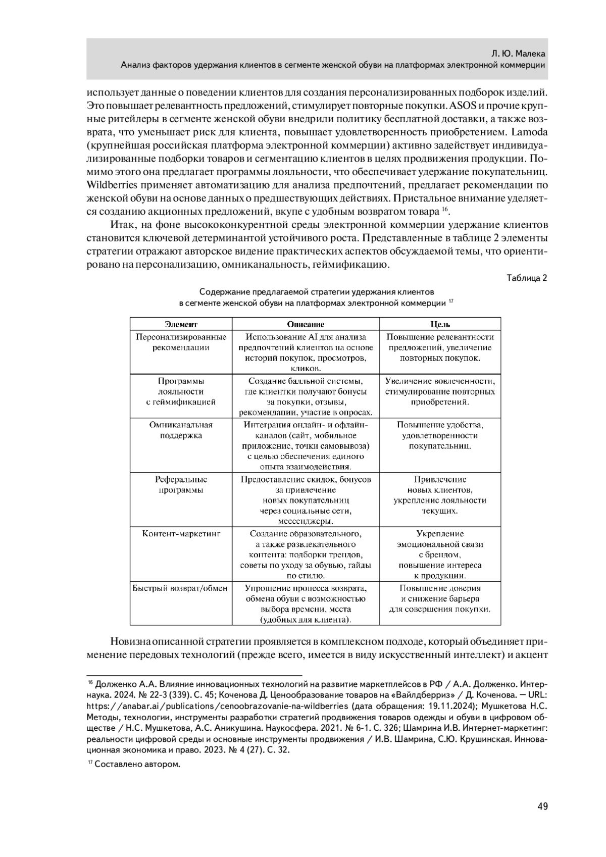 МАЛЕКА Л. Ю. АНАЛИЗ ФАКТОРОВ УДЕРЖАНИЯ КЛИЕНТОВ В СЕГМЕНТЕ ЖЕНСКОЙ ОБУВИ НА ПЛАТФОРМАХ ЭЛЕКТРОННОЙ КОММЕРЦИИ // РОССИЙСКАЯ АКАДЕМИЯ ПРЕДПРИНИМАТЕЛЬСТВА. 2025. Т. 18, № 1