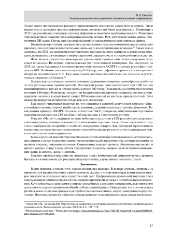 10. Смотрова Т.И., Наролина Т.С. Тенденции цифровизации в розничной торговле. Экономинфо. 2020. №. 1. С. 55-60.