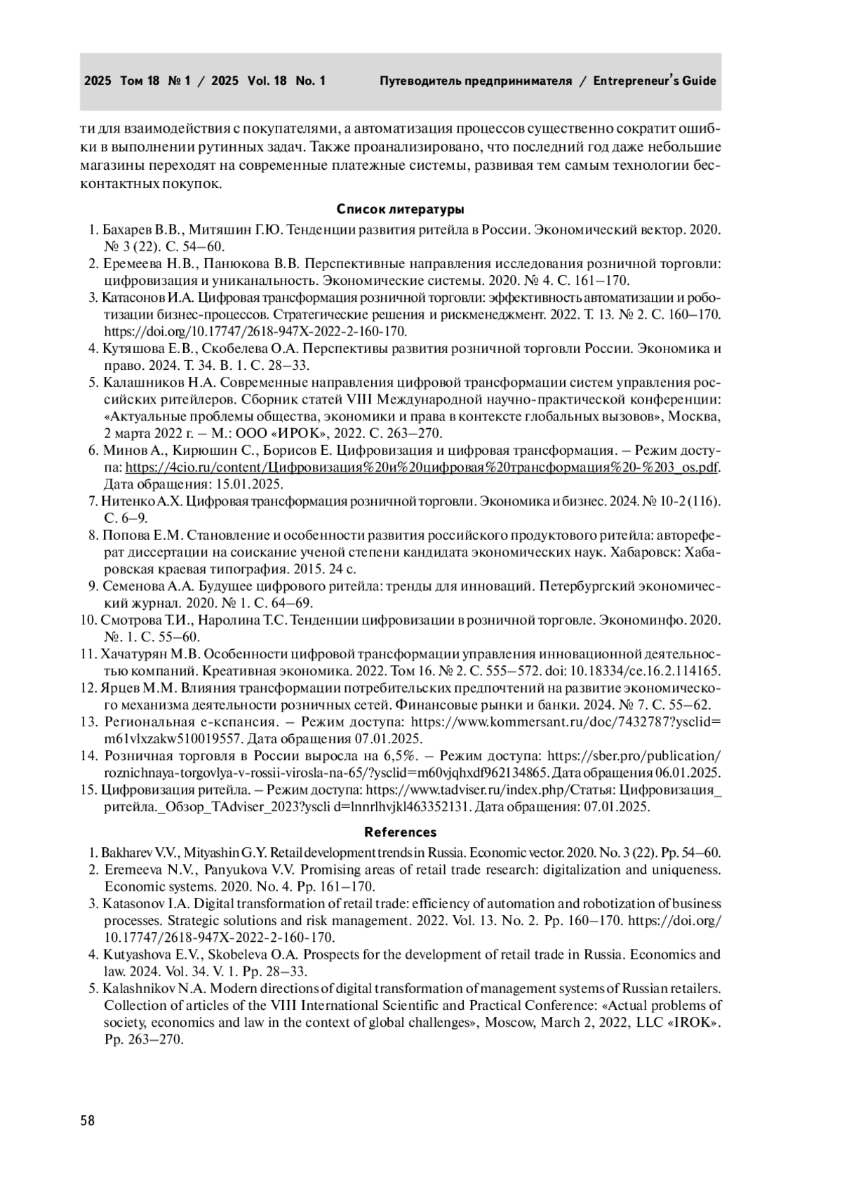 1. Бахарев В.В., Митяшин Г.Ю. Тенденции развития ритейла в России. Экономический вектор. 2020. № 3 (22). С. 54-60.