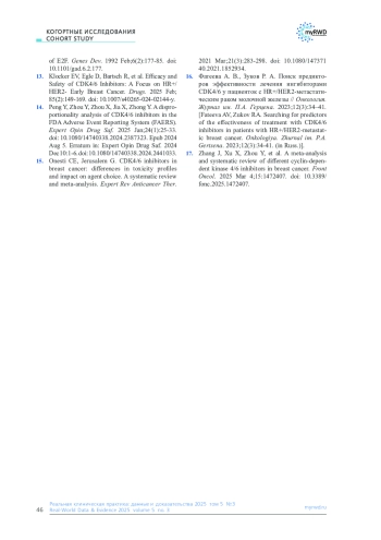13. Klocker EV, Egle D, Bartsch R, et al. Efficacy and Safety of CDK4/6 Inhibitors: A Focus on HR+/ HER2- Early Breast Cancer. Drugs. 2025 Feb; 85(2):149-169. DOI: 10.1007/s40265-024-02144-y EDN: FXIBSI