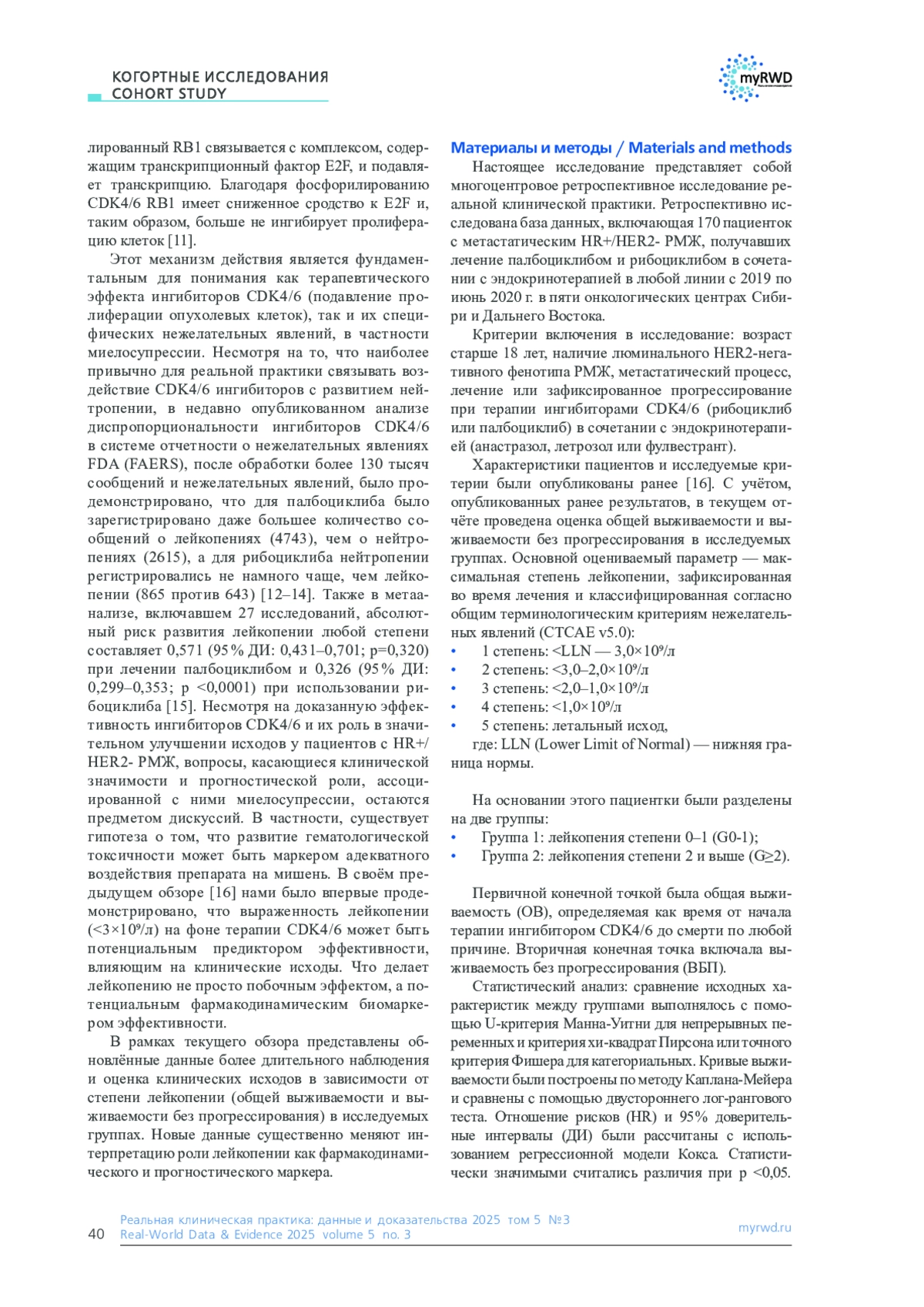 16. Фатеева А. В., Зуков Р. А. Поиск предикторов эффективности лечения ингибиторами CDK4/6 у пациенток с HR+/HER2-метастатическим раком молочной железы // Онкология. Журнал им. П.А. Герцена. 2023;12(3):34-41. EDN: MYFLRU
