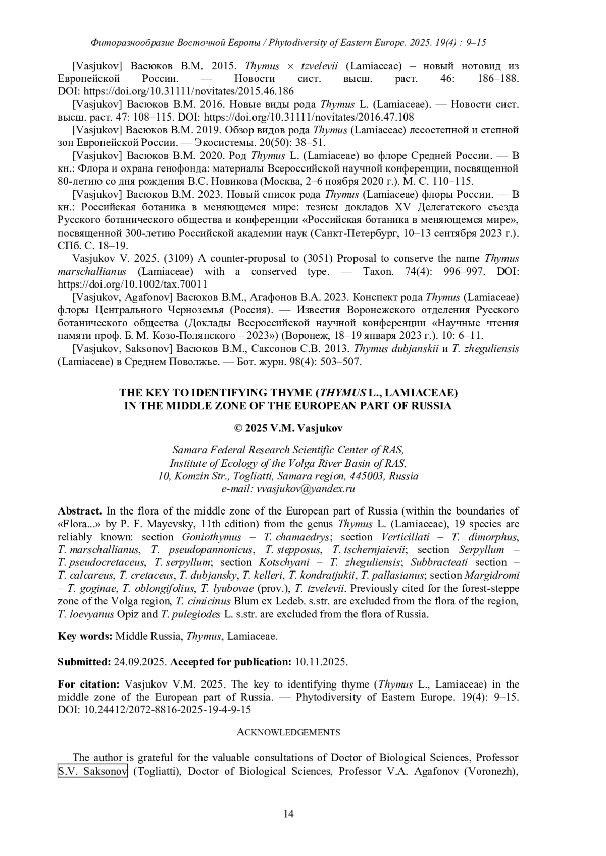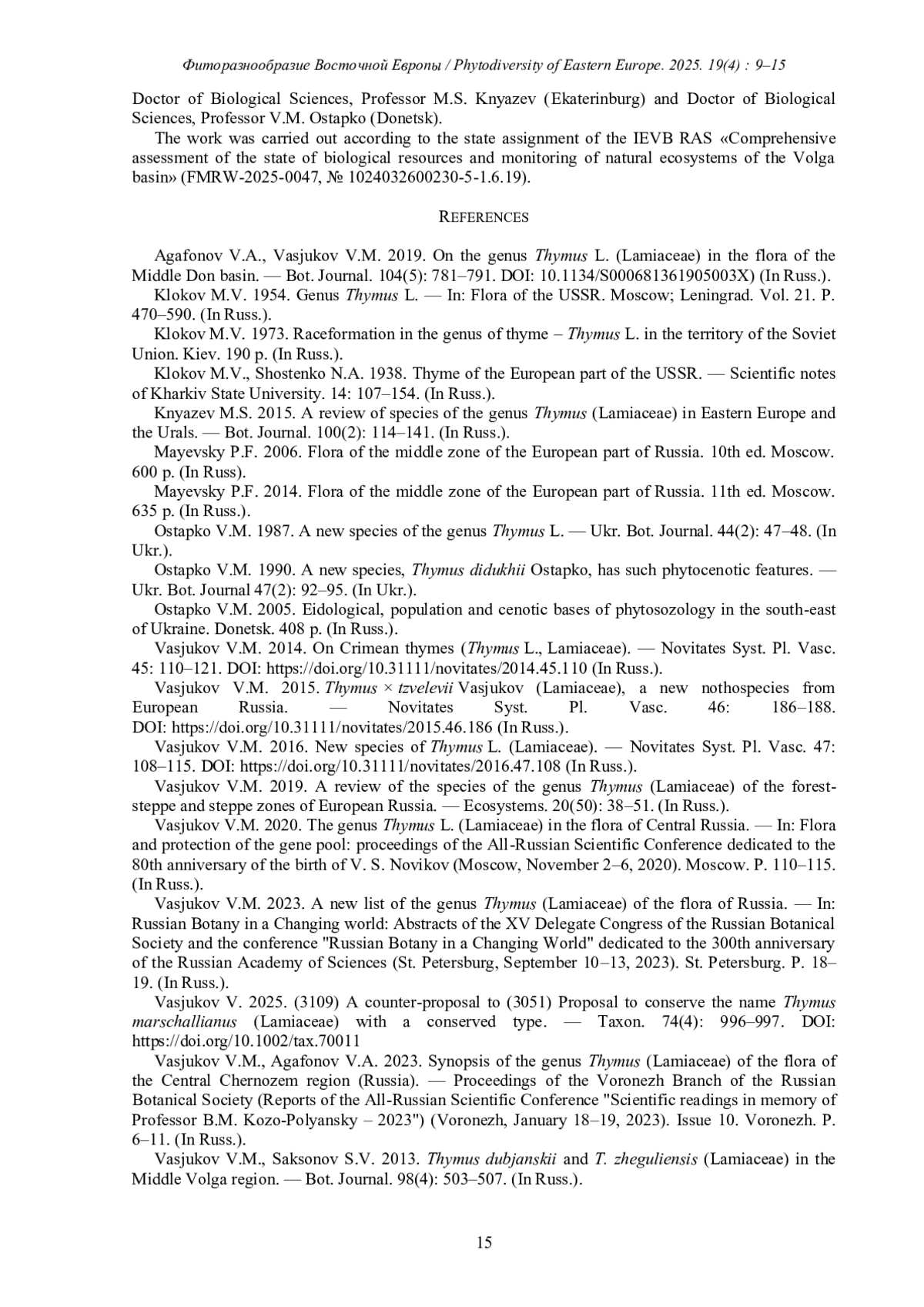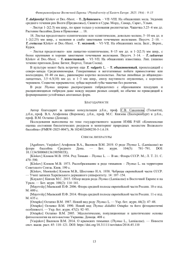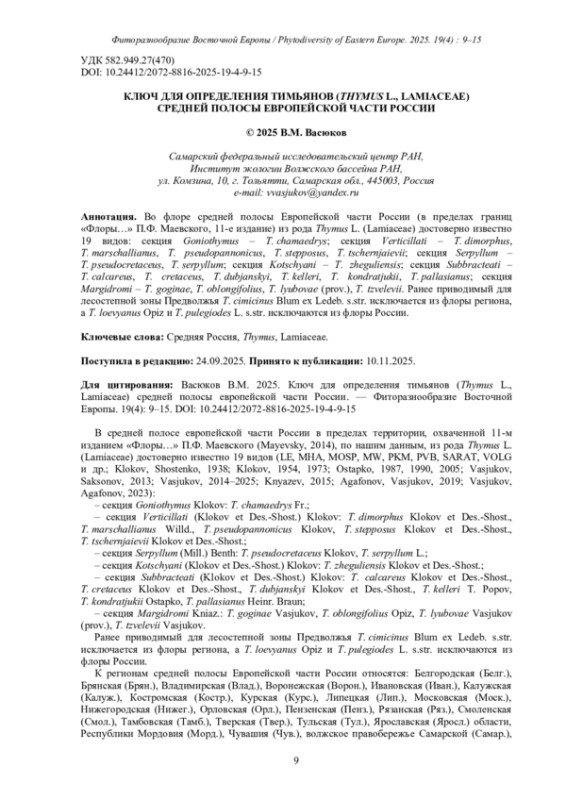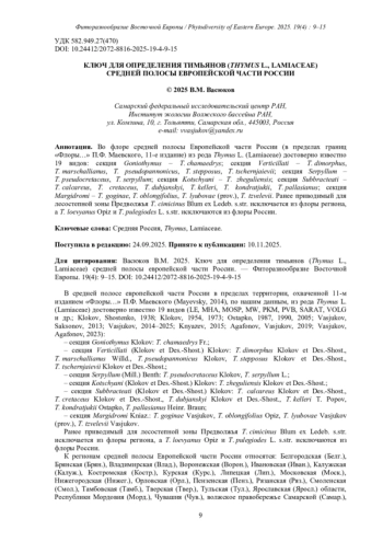 14. [Vasjukov] Васюков В.М. 2019. Обзор видов рода Thymus (Lamiaceae) лесостепной и степной зон Европейской России. - Экосистемы. 20(50): 38-51.