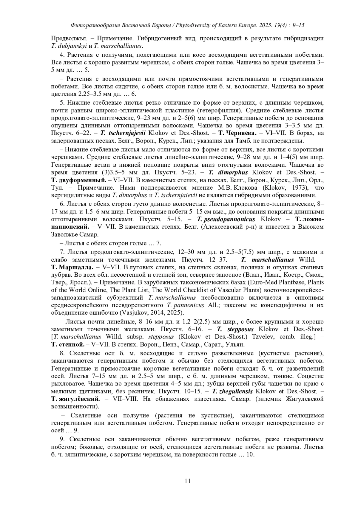 Листья продолговато-эллиптические, 12–30 мм дл. и 2.5–5(7.5) мм шир., с мелкими и слабо заметными точечными железками. Пкустч. 12–37. – T. marschallianus Willd. – Т. Маршалла. – V–VII. В луговых степях, на степных склонах, полянах и опушках степных дубрав. Во всех обл. лесостепной и степной зон, севернее заносное (Влад., Иван., Костр., Смол., Твер., Яросл.). – Примечание. В зарубежных таксономических базах (Euro-Med Plantbase, Plants of the World Online, The Plant List, The World Checklist of Vascular Plants) восточноевропейскозападноазиатский субэректный T. marschallianus необоснованно включается в синонимы среднеевропейского псевдорепентного T. pannonicus All.; таксоны не конспецифичны и их объединение ошибочно (Vasjukov, 2014, 2025).