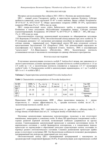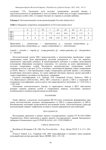 В изученных ценопопуляциях плотность особей P. kudrjaschevii низкая, вне зависимости от эколого-ценотических условиях произрастания. Средняя плотность особей колеблется от 1.8 до 2.9 особи на 1 м², а экологическая плотность изменяется в переделах 2.5–3.7 экземпляров особь/м2 (табл. 1). Распределение особей в ценопопуляции неравномерное, от 1 до 5 особей в ЦП-1 и от 1–6 особей в ЦП-2.