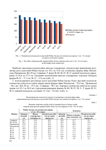 В статье приведены результаты изучения влияния препаратов Эпин-экстра и Рибав-Экстра на раз-личные формы айвы, возделываемой в маточнике. Изучали высоту маточных растений, наибольший выход стан-дартных отводков, диаметр штамба, и количество побегов на одном дереве. Использовали формы айвы: ВА 29 (к), Северная, Прованская, Пензенская, № 13, № 21, № 25, № 31, № 40. Выявлено, что использование регулятора роста растений Рибав-Экстра для полива под корень (1 мл / 10 л воды) наиболее эффективным оказалось для подвоев айвы Пензенская, Прованская, ВА 29 (к), Северная. В этом случае анализируемые показатели характеризовались высокими значениями. Без применения регулятора роста растений наибольшую высоту маточных деревьев, наибольший выход стандартных отводков, диаметр штамба, количество побегов на одном дереве продемонстриро-вали формы айвы Пензенская, Прованская, ВА 29 (к), Северная. При использовании регулятора роста растений Эпин-экстра – опрыскивание (1 мл / 5 л воды на одно дерево) – наибольшей высотой маточных деревьев, наилуч-шим выходом стандартных отводков, диаметром штамба, количеством побегов на одном дереве характеризовались формы айвы Пензенская, Прованская, ВА 29 (к), Северная. Без применения регулятора роста растений лучшим показателем высоты деревьев, наибольшим выходом стандартных отводков, наилучшим результатом диаметра штамба, наибольшим количеством побегов на одном дереве отличались формы айвы Пензенская, Прованская, ВА 29 (к), Северная. Полученные данные свидетельствуют о том, что при применении регуляторов роста растений Рибав-Экстра и Эпин-экстра лучший результат показали формы айвы ВА 29 (к), Пензенская, Прованская, Север-ная, и такие формы можно рекомендовать для дальнейшего использования в селекции.