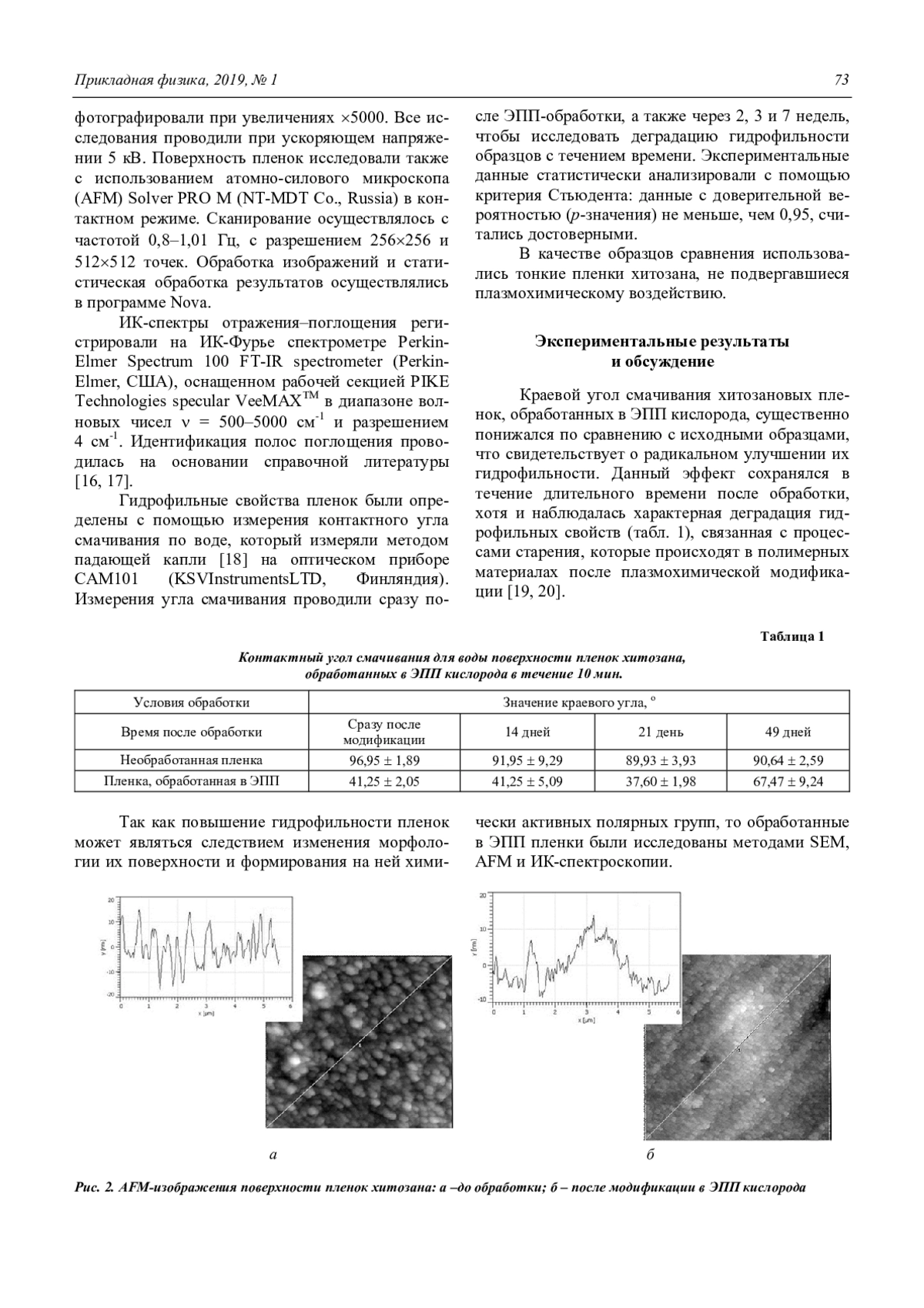 Экспериментально исследована возможность модификации тонких пленок хитозана в электронно-пучковой плазме кислорода. Плазмохимическая модификация пленок приводила к снижению кристалличности, увеличению содержания кислородсодержащих полярных групп, в первую очередь, –СООН. Также наблюдалось, по сравнению с исходными образцами, повышение гидрофильности поверхности хитозановых пленок, модифицированных в электроннопучковой плазме, причем этот эффект сохранялся по крайней мере в течение трех недель после обработки.