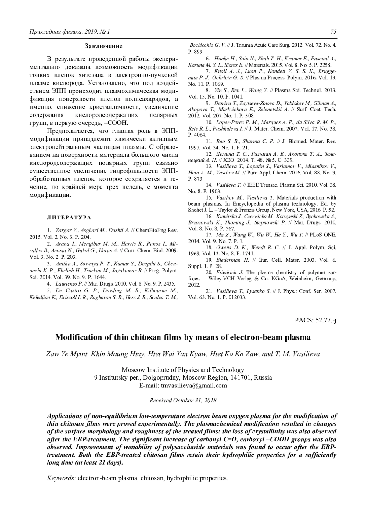 Зау Йе Мьинт, Кхин Маунг Хтау, Хтет Вэй Ян Чжо, Хтет Ко Ко Зау, Васильева Т. М. Модификация тонких пленок хитозана в электронно-пучковой плазме 71